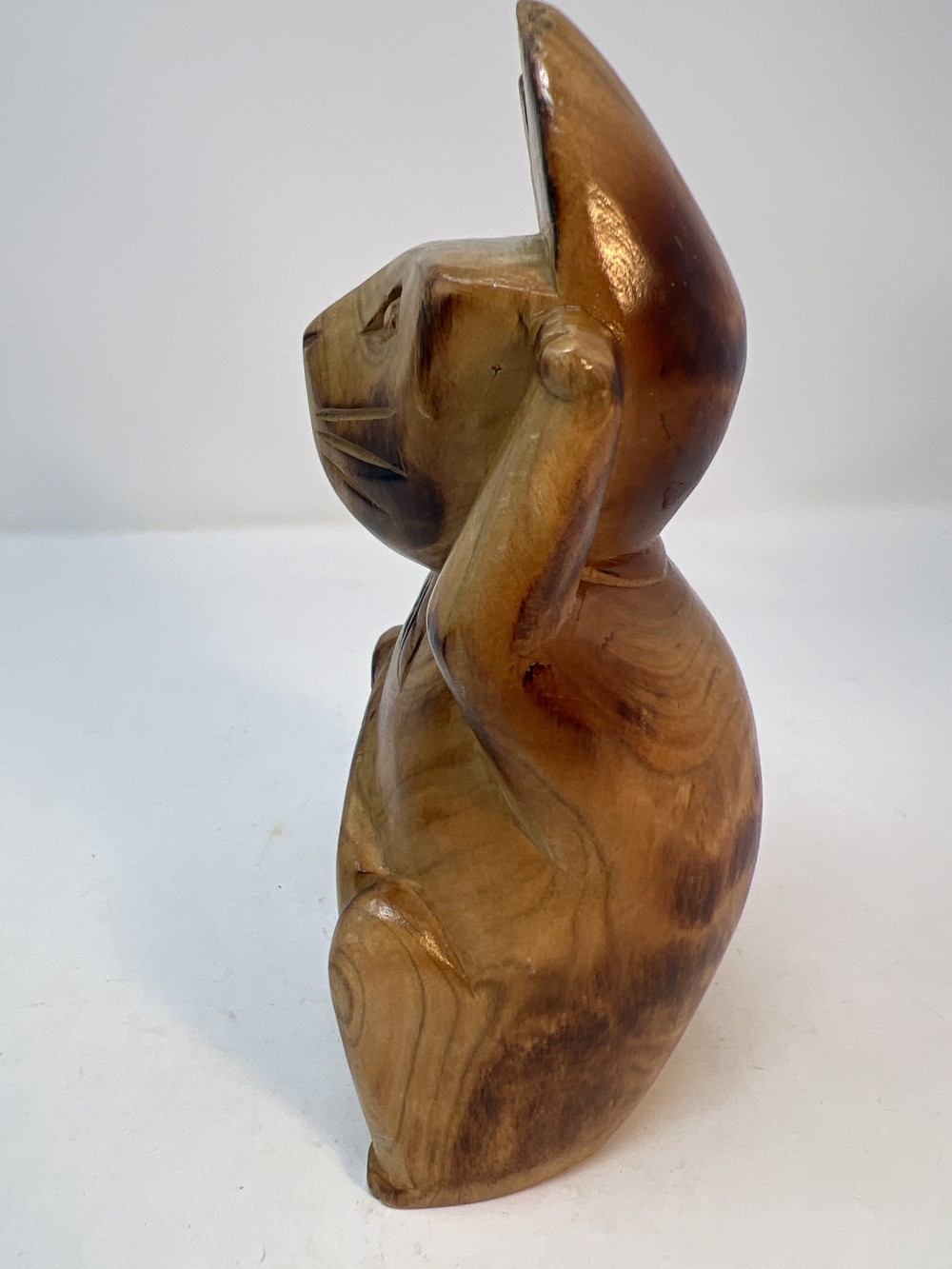 Vintage Lucky Cat Figure Hand Carved Wooden Statue