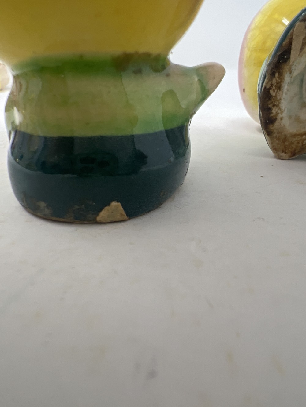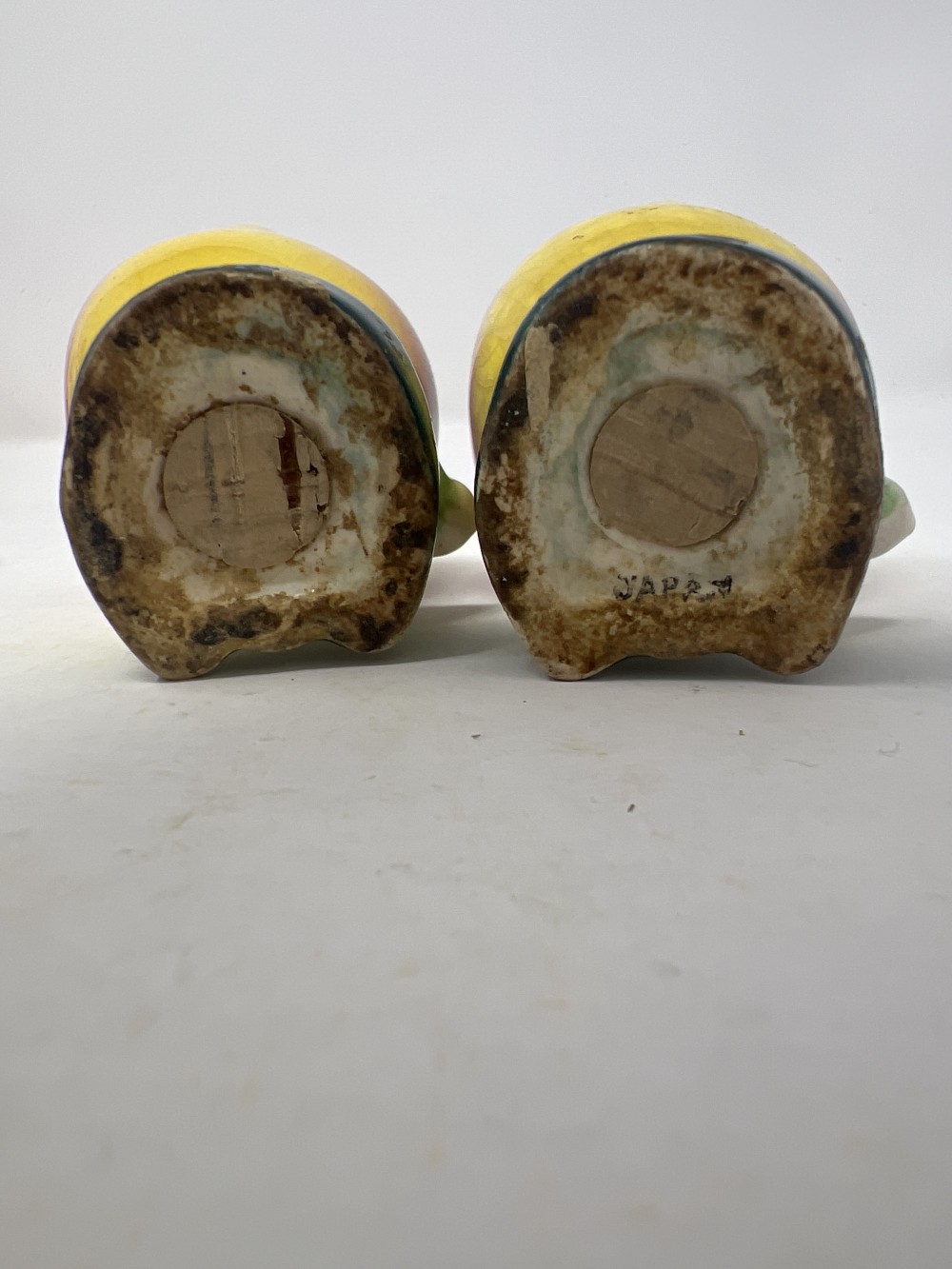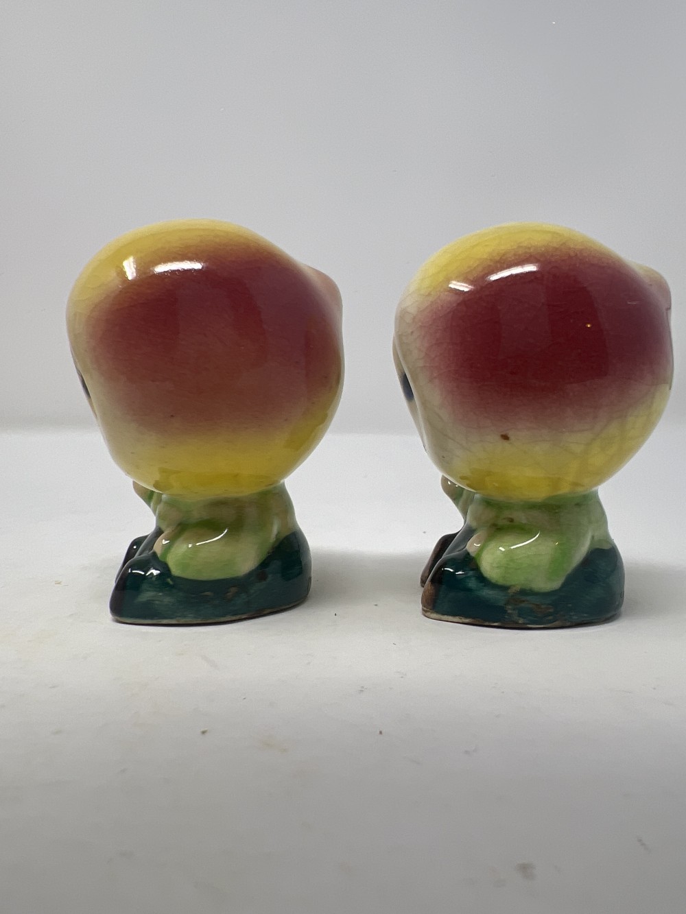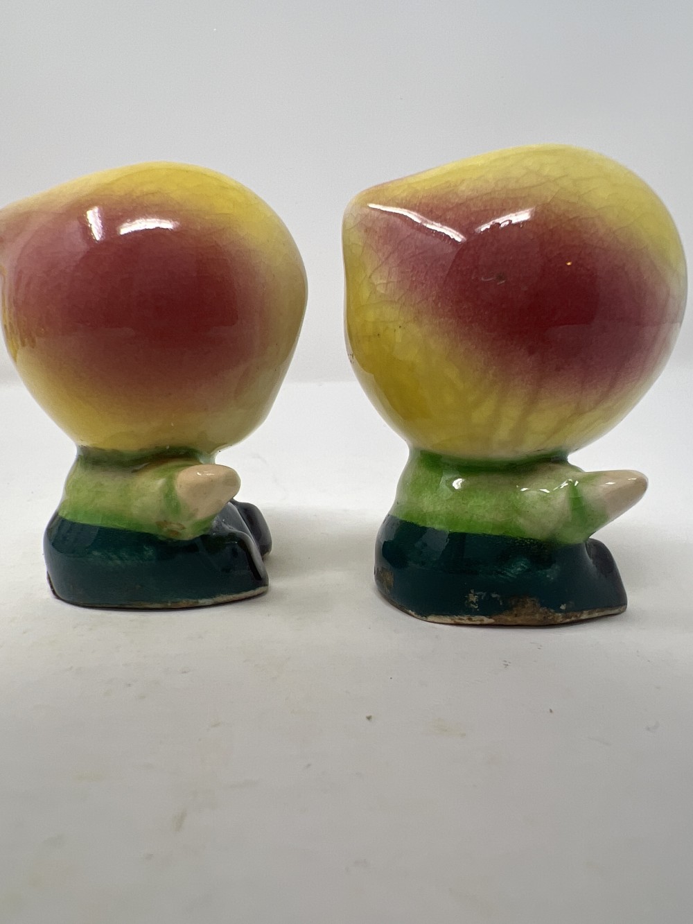 1950's Japan Anthropomorphic Peach Head Boys Salt and Pepper Shaker Set; crazing as expected with age, stoppers intact; approx 2.25” tall; small chip in back on bottom as shown in photos