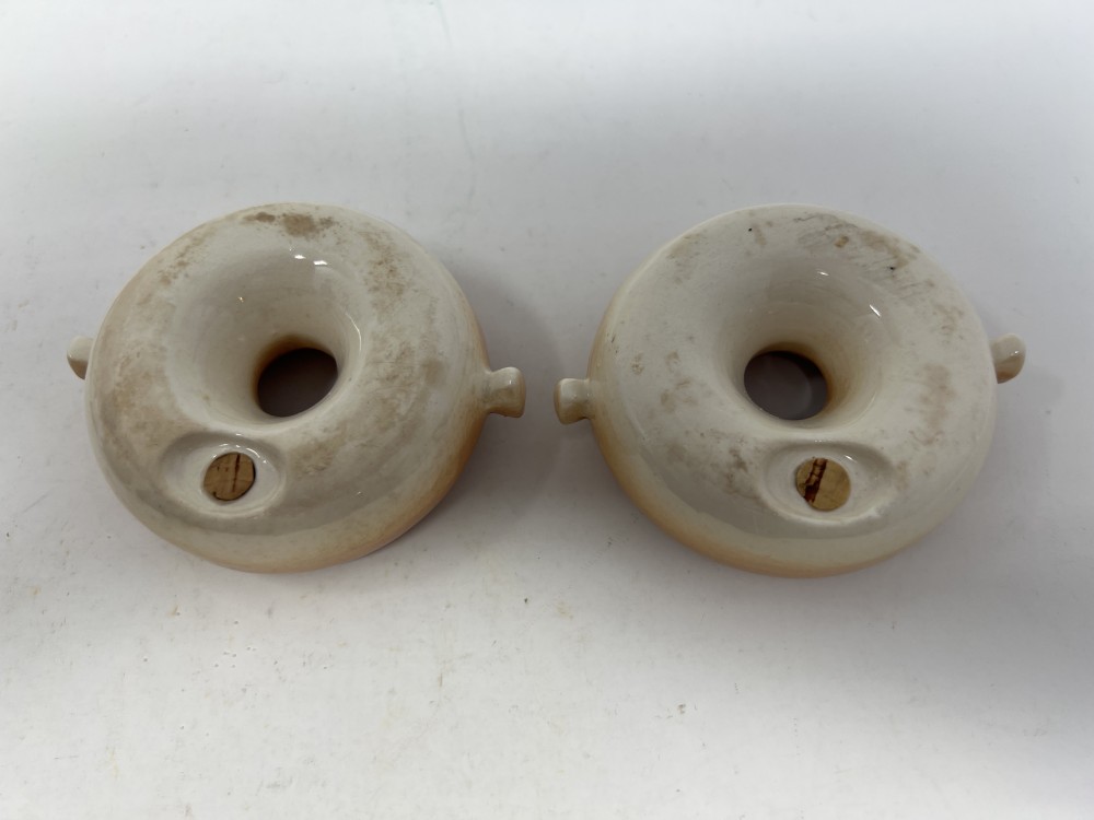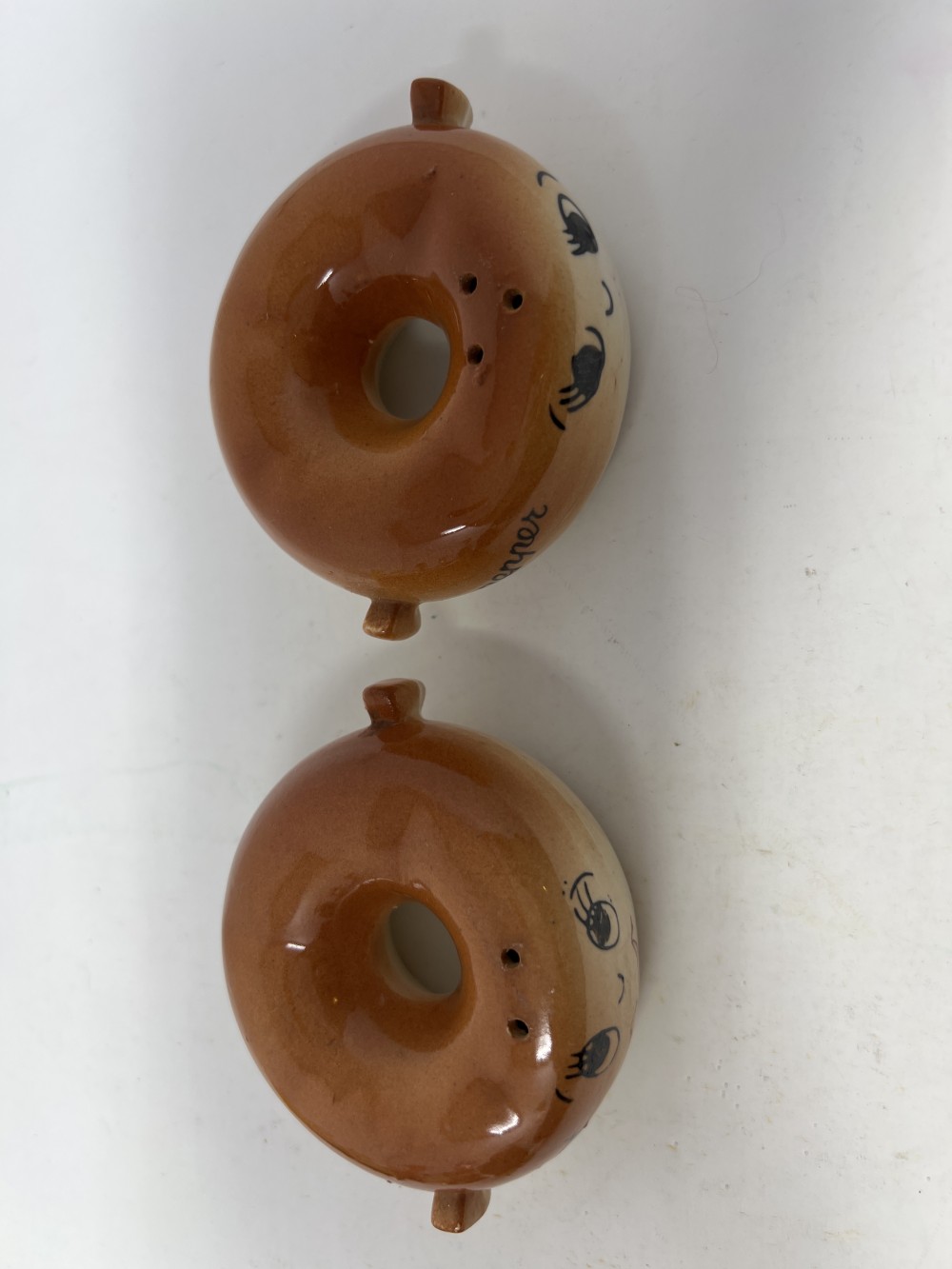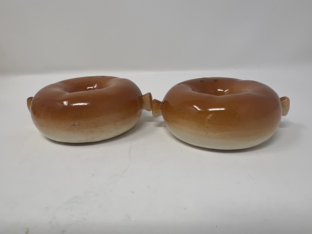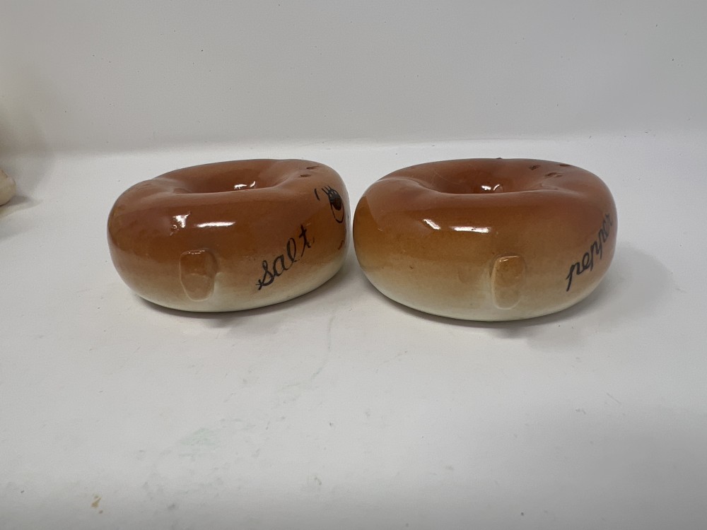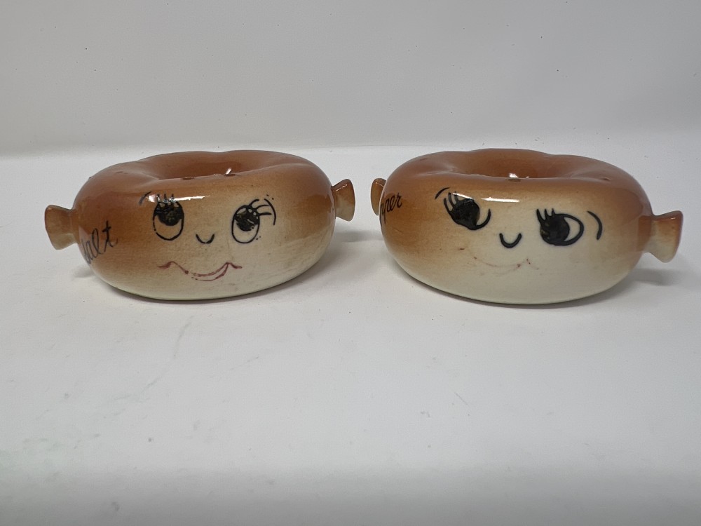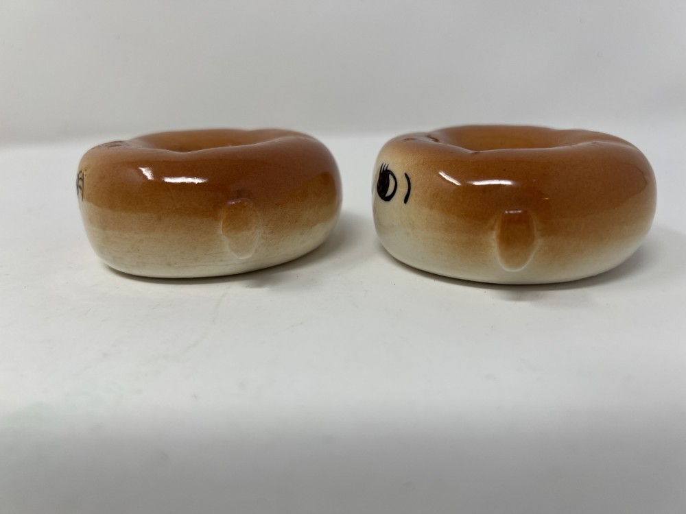 Vintage Anthropomorphic Donut Salt And Pepper Shaker Set; Stackable; Japan; stoppers intact; minor paint loss as shown in photos