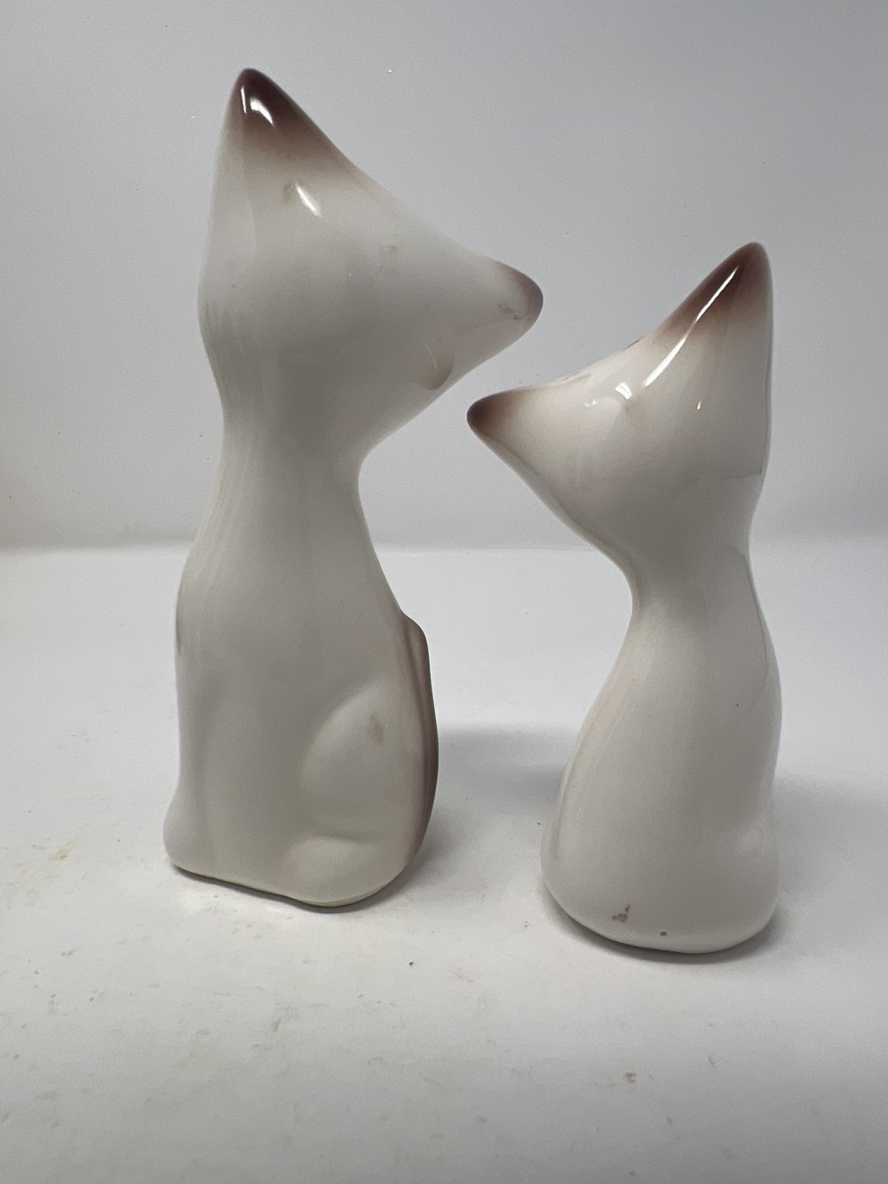 Vintage Siamese Cat Salt And Pepper Set; minor paint loss and one flea bite on taller cats ear; 5” and 4”; stoppers have been replaced