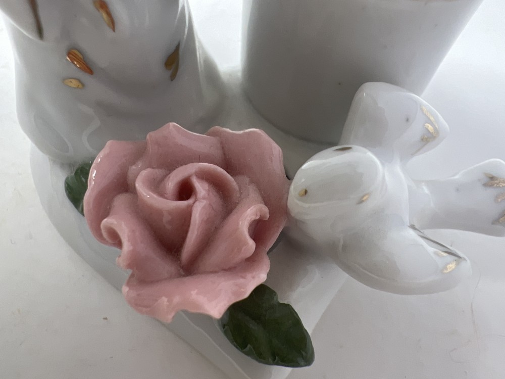 Vintage Porcelain Gold Trimmed Angel Lamb Dove Flower Heart Candle Holder; approx 3” x 2.5”