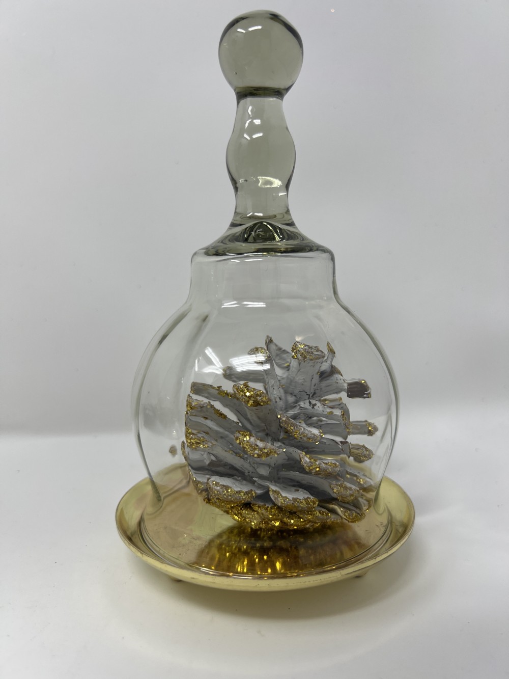 Glass Bell Shaped Cloche with gold base and pinecone decor; approx 7”