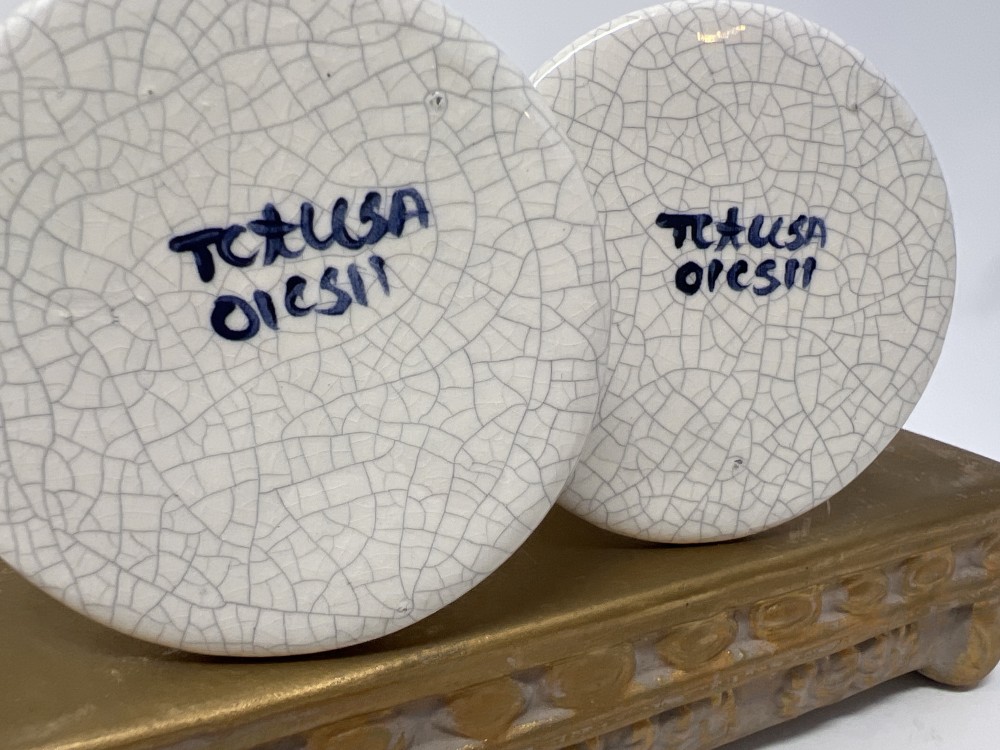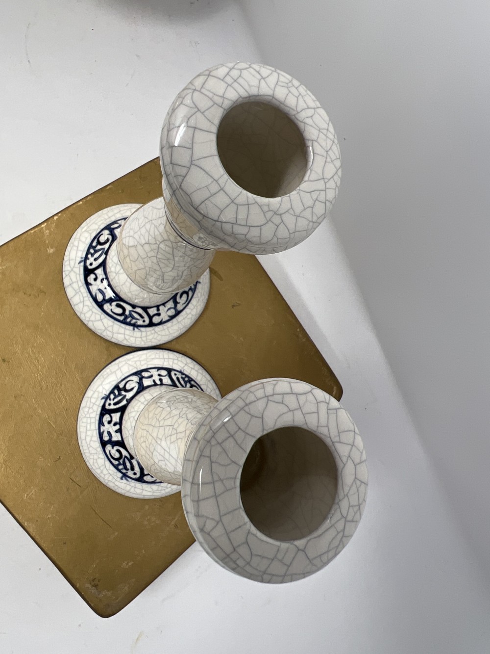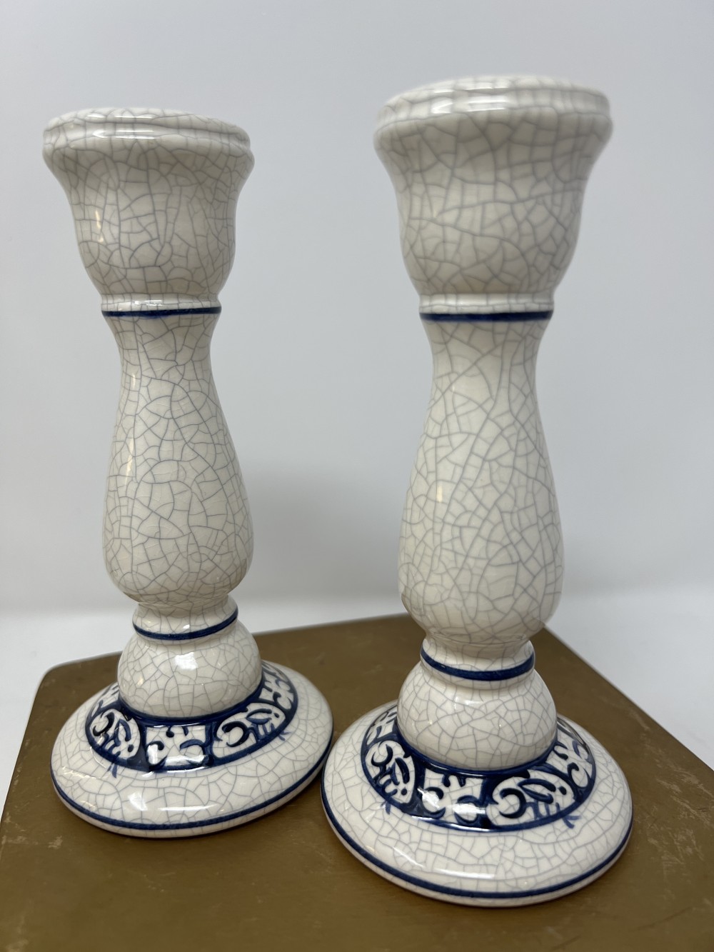 Pair of Dedham Style Pottery Blue White Crackle Candle Holders; approx 6” tall