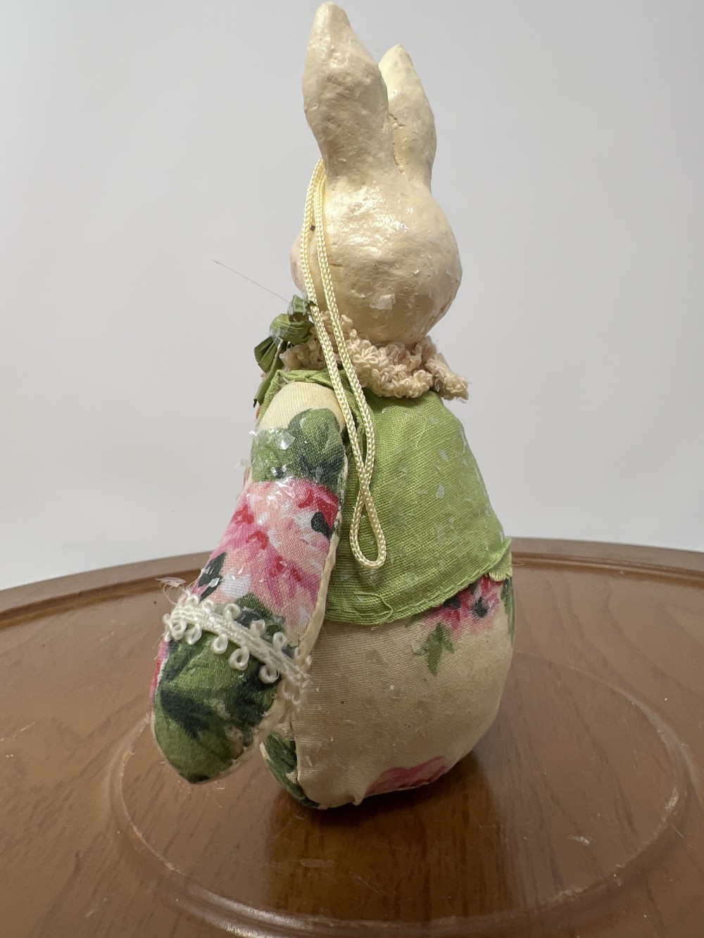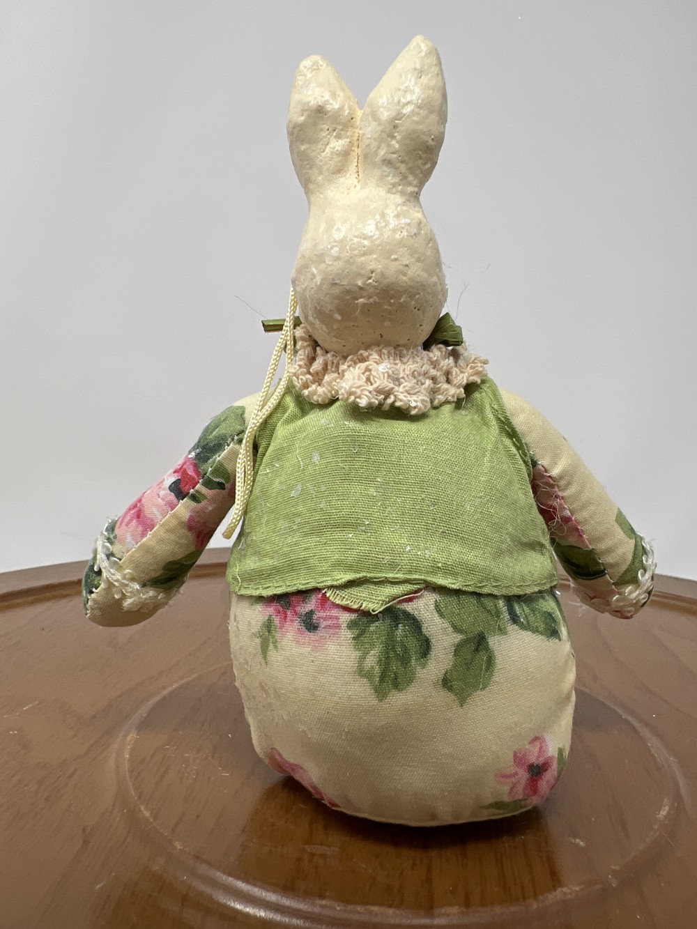 Vintage Decorative Mr. Bunny with paper mache head, fabric body, green vest, and floral accents.