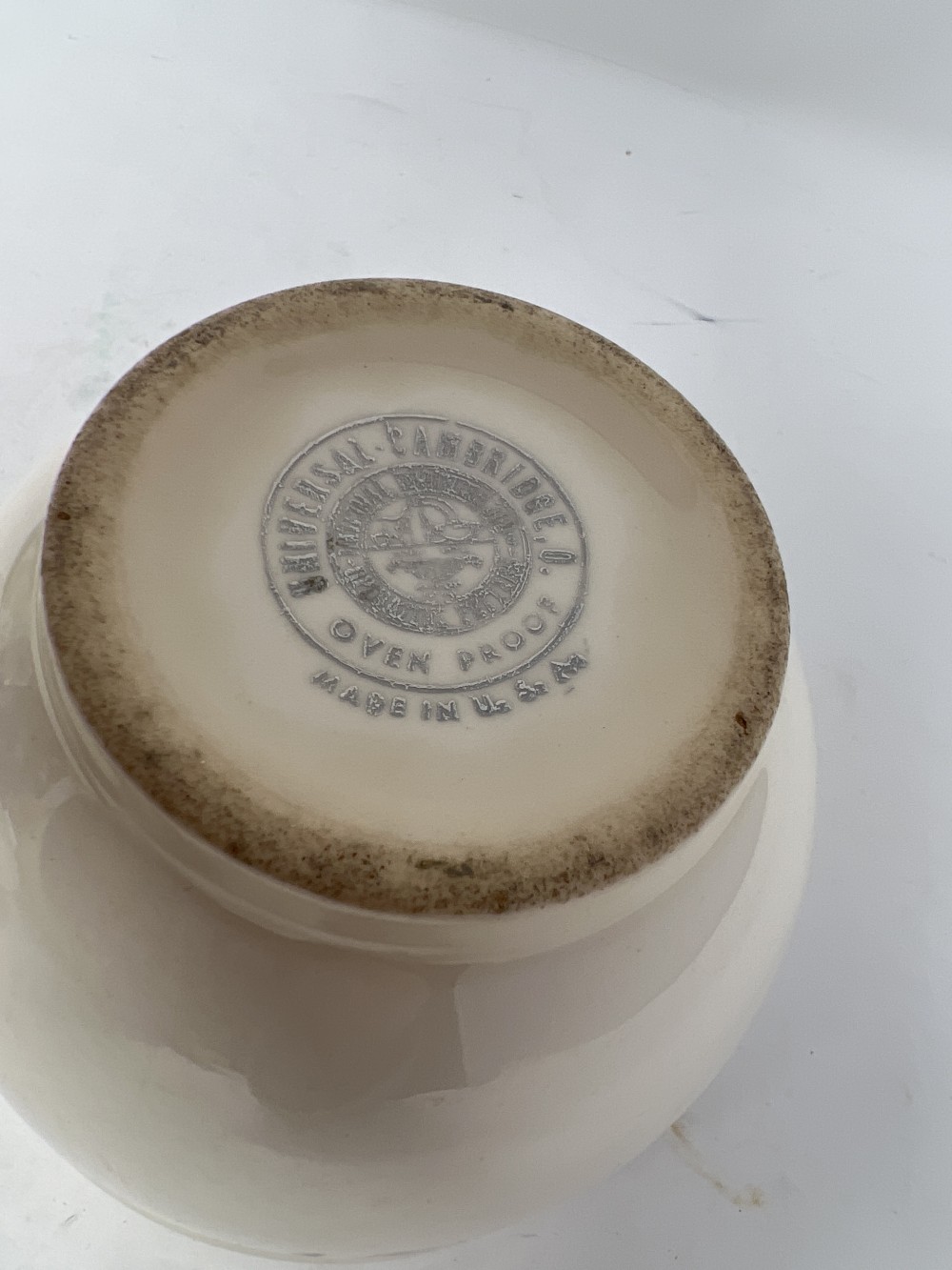 Creamy ivory glazed ceramic bowl featuring a soft pink floral motif with green leaves and delicate branch detail. Marked Universal Cambridge – Cambridge Ovens – Made in U.S.A. on the underside.