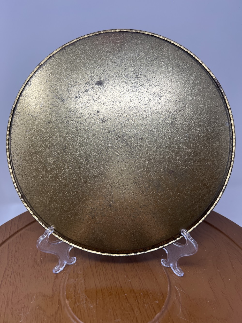 Vintage round tin tray featuring a buffalo scene by wildlife artist Ken Haag. Lithographed image with aged patina finish and rolled edge rim.