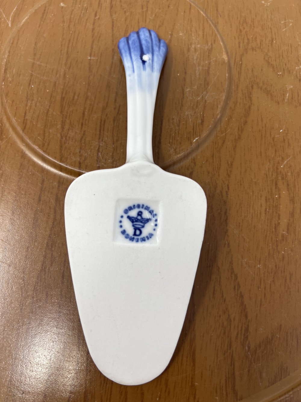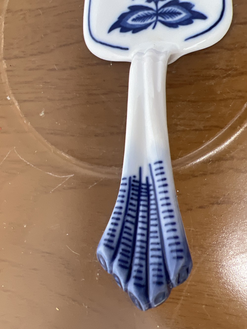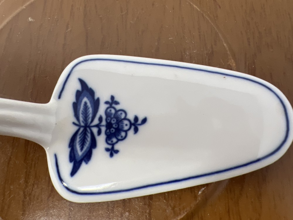 Vintage porcelain cake server in the classic Blue Onion (Zwiebelmuster) pattern, featuring cobalt blue floral decoration and a decorative handle. Ideal for serving cake, pie, or pastries.
