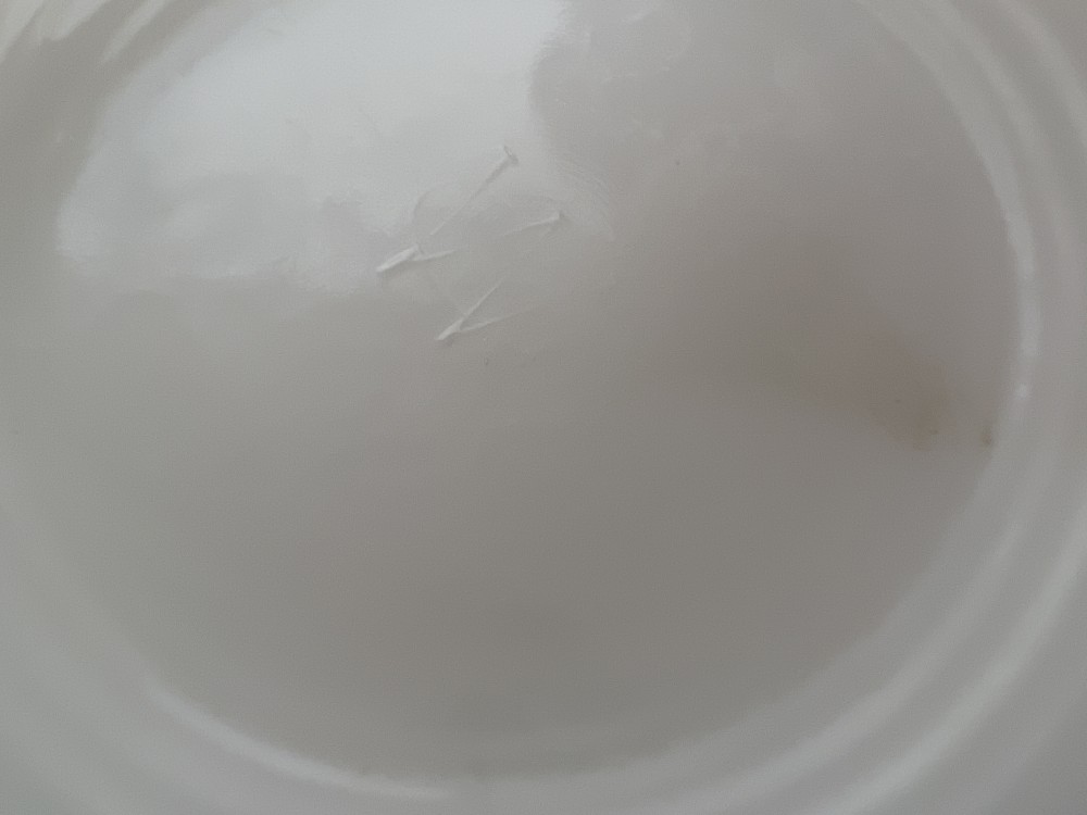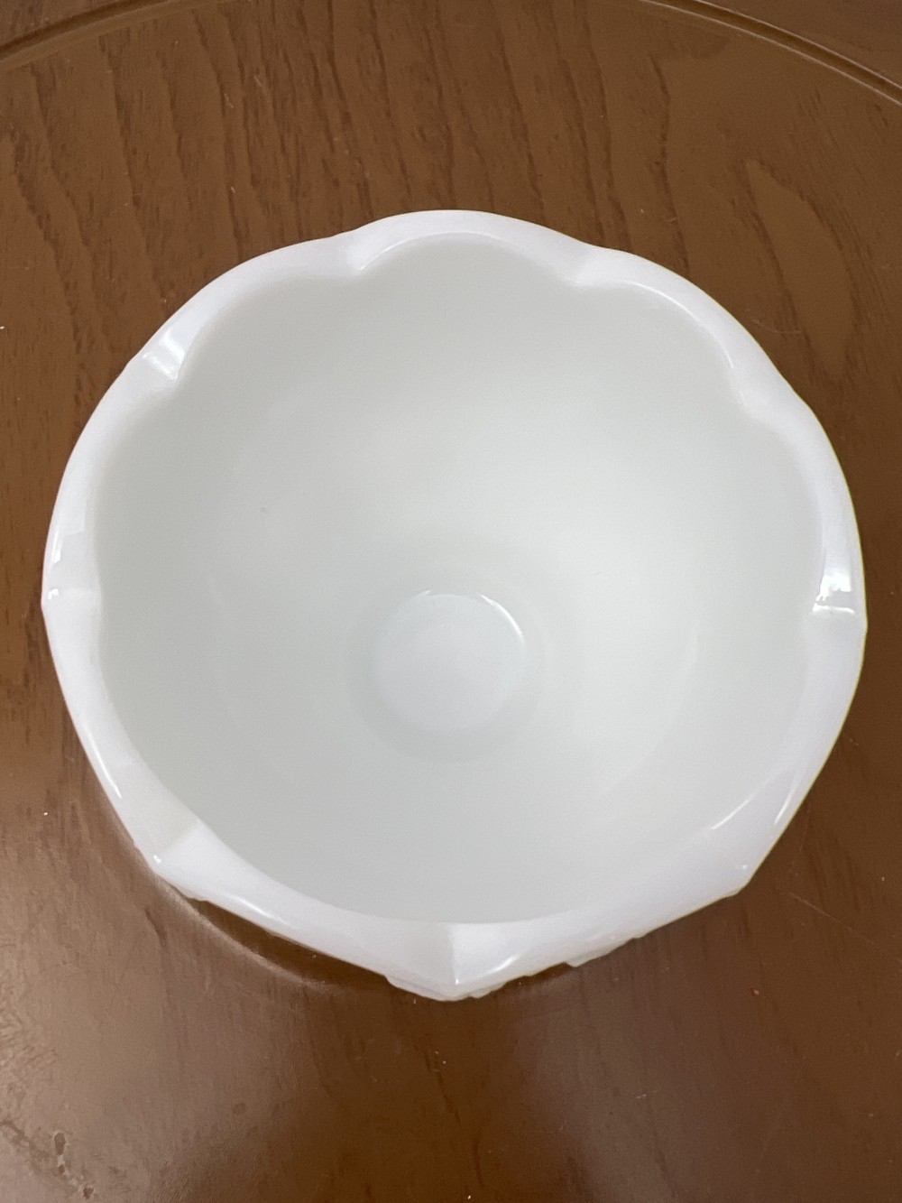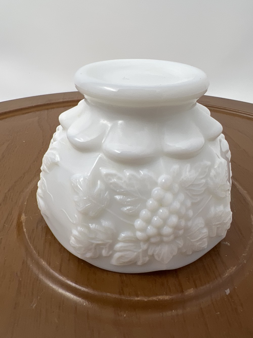 Vintage white milk glass dish with raised grapevine pattern and scalloped rim.