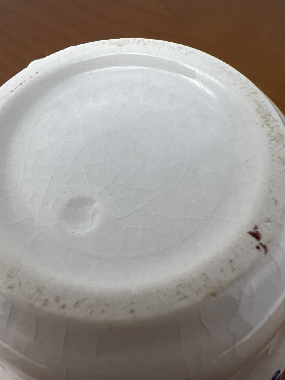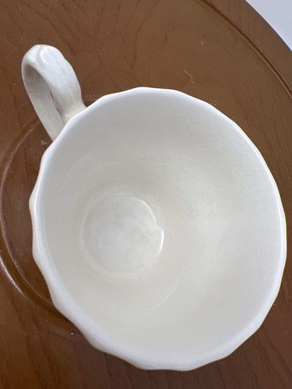 Vintage porcelain cup with classic cobalt floral motif and scalloped rim. Crazing and discoloration consistent with age. As shown in photos.