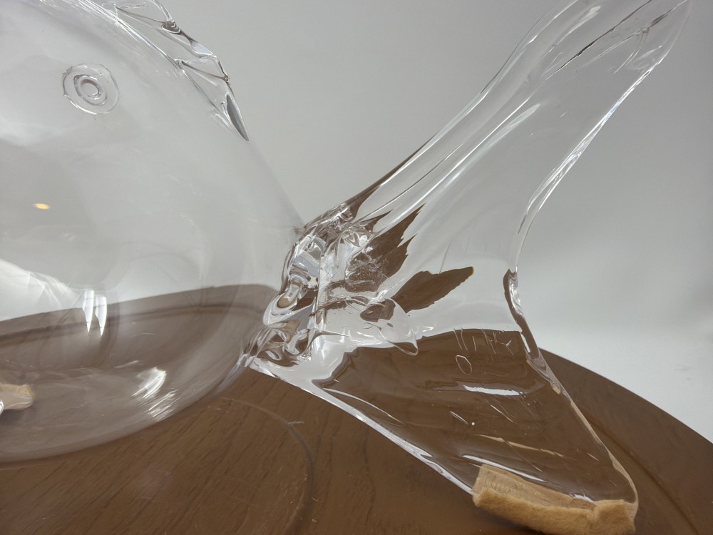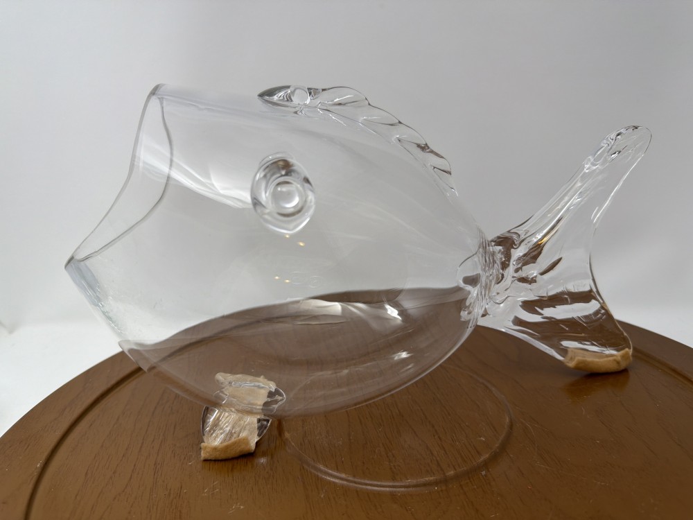 Clear sculptural glass in a fish form with applied fins and open mouth. Ideal as a terrarium, planter, or decorative accent. Mid-to-late 20th century. Blank style — not Blenko. Approx. dimensions: 12.5” x 7”. Vintage condition as shown on images.