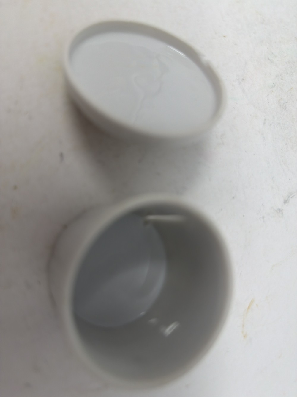 Vtg Porcelain Rolled Stamp Dispenser/Trinket box; minor paint loss and flea bite as shown in photos; approx 2” x 2”