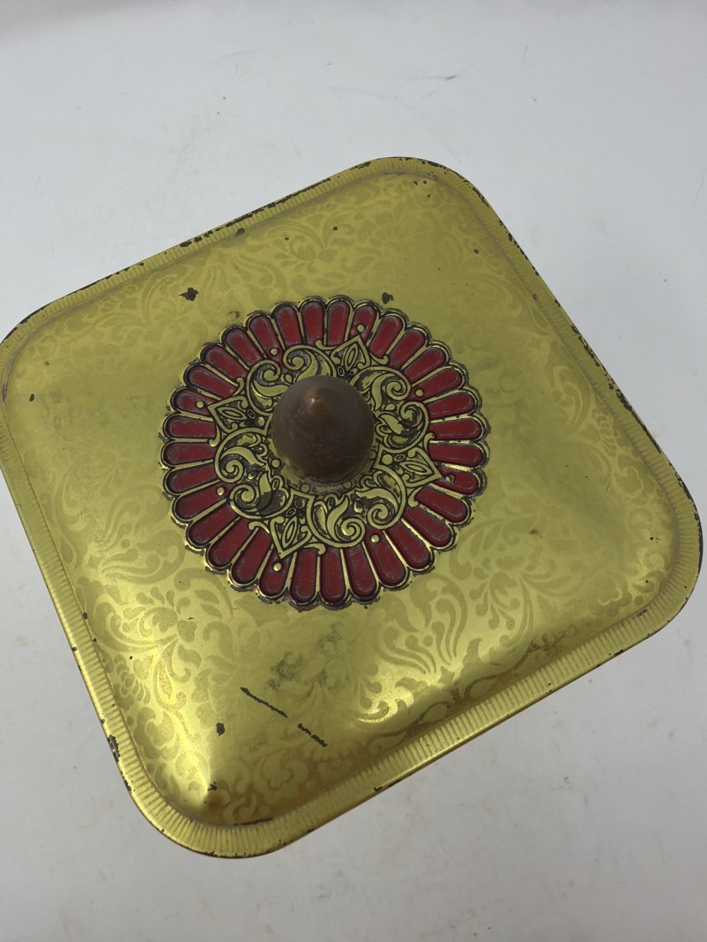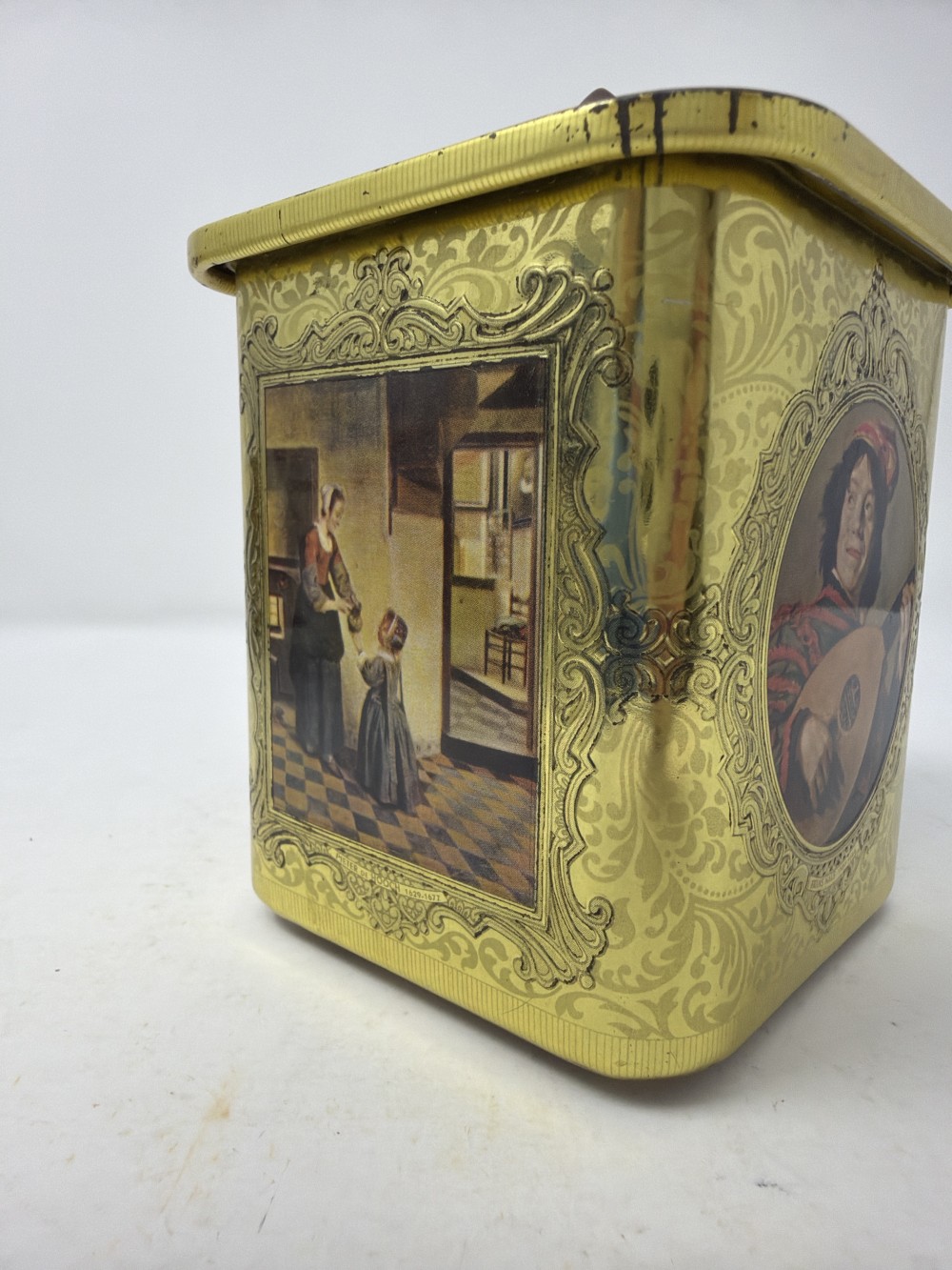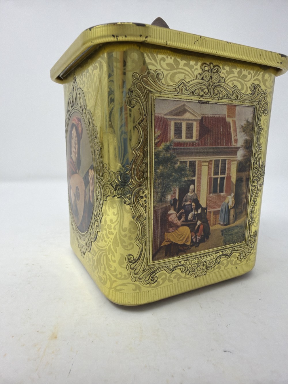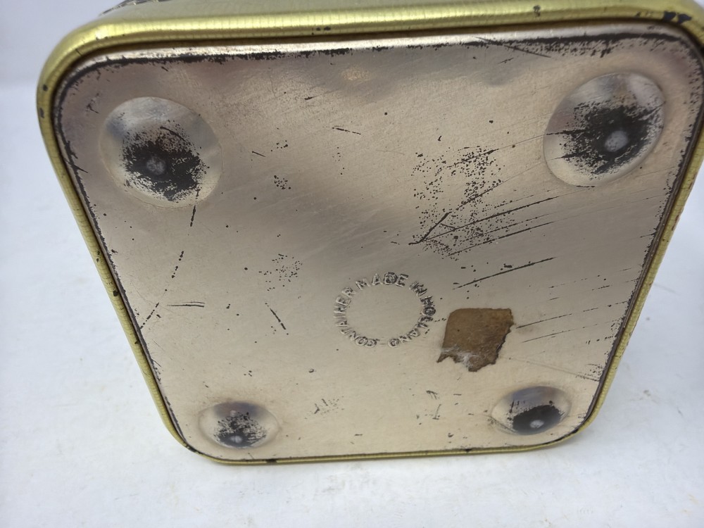 Vintage Square Dutch Art Lidded Tin Made in Holland approx 4x4" ; patina as shown in photos