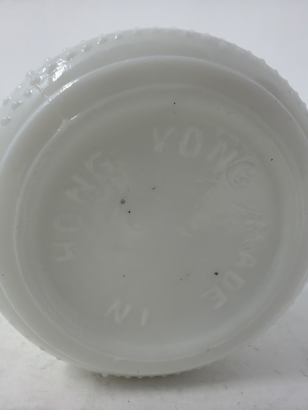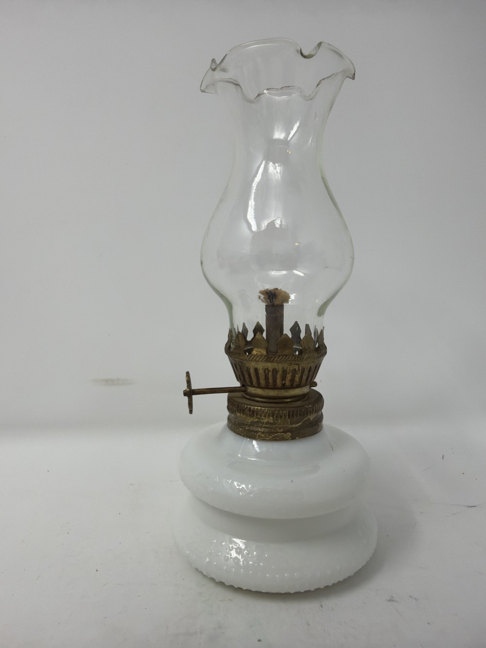 Vintage White Milk Glass Oil Lamp approx 6.5" Tall; made in Hong Kong. Patina consistent with age.