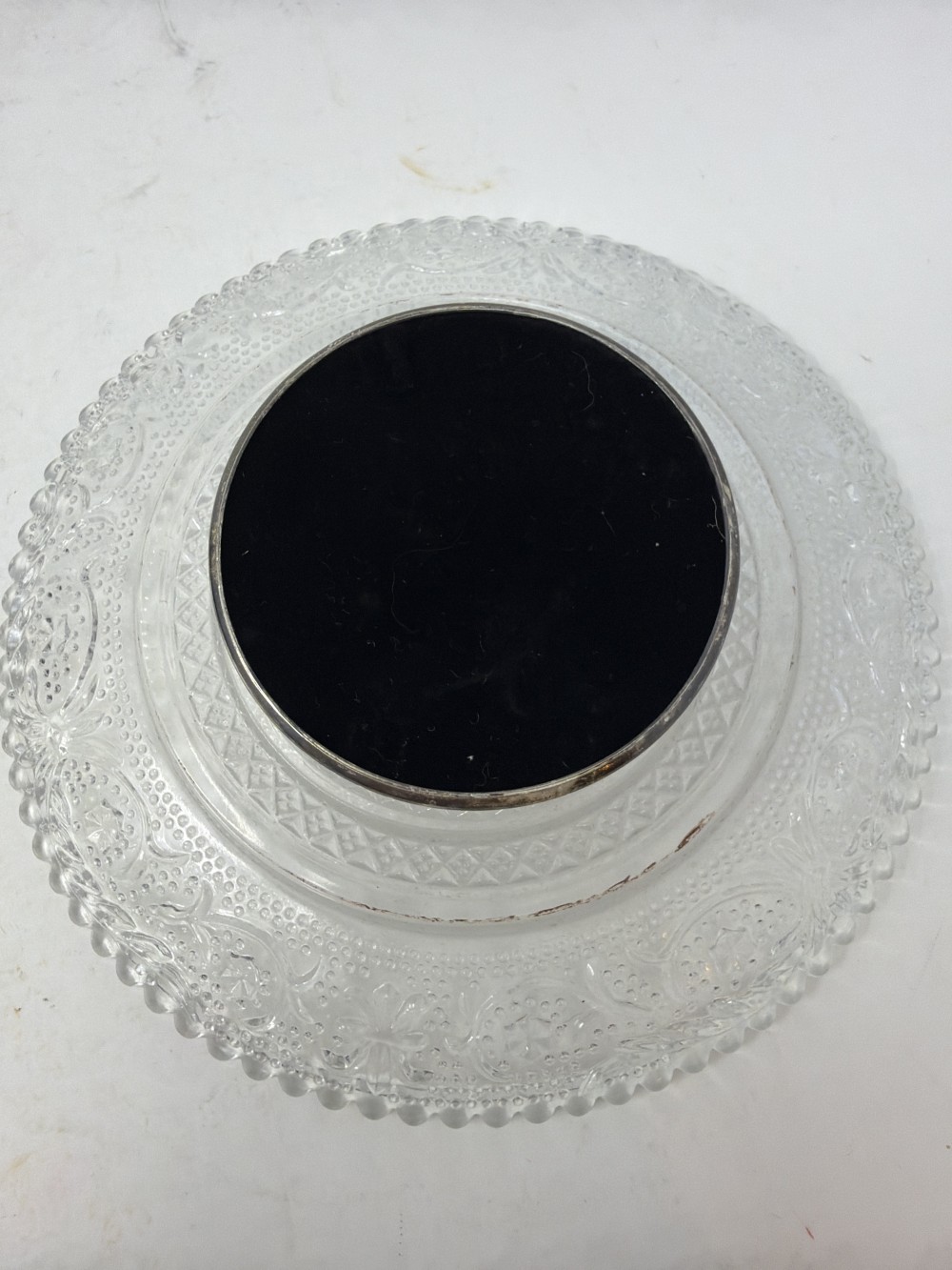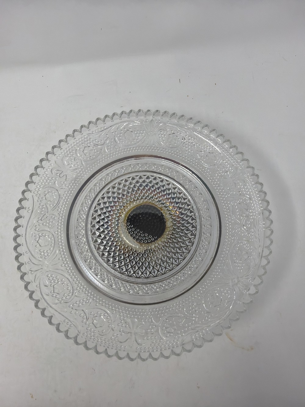 Clear pressed glass pedestal server by Fairfield Crystal. Patina consistent with age.