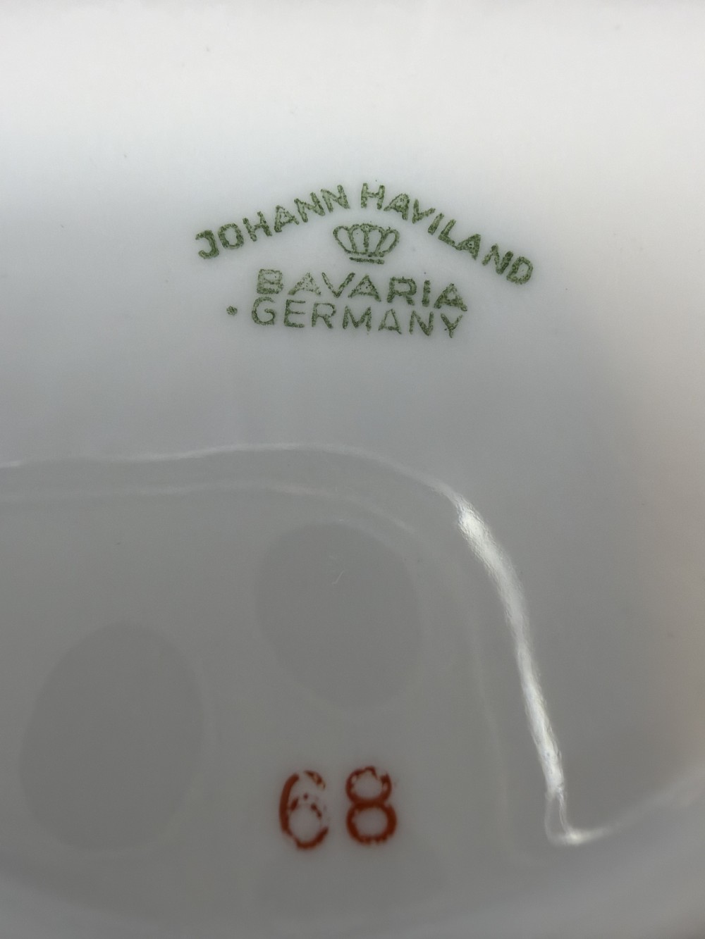 Porcelain butter pat with blue floral pattern and scalloped edge, marked Johann