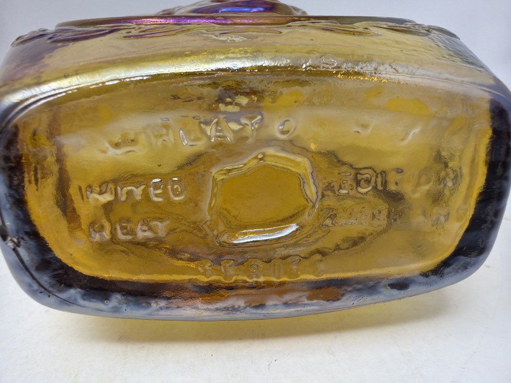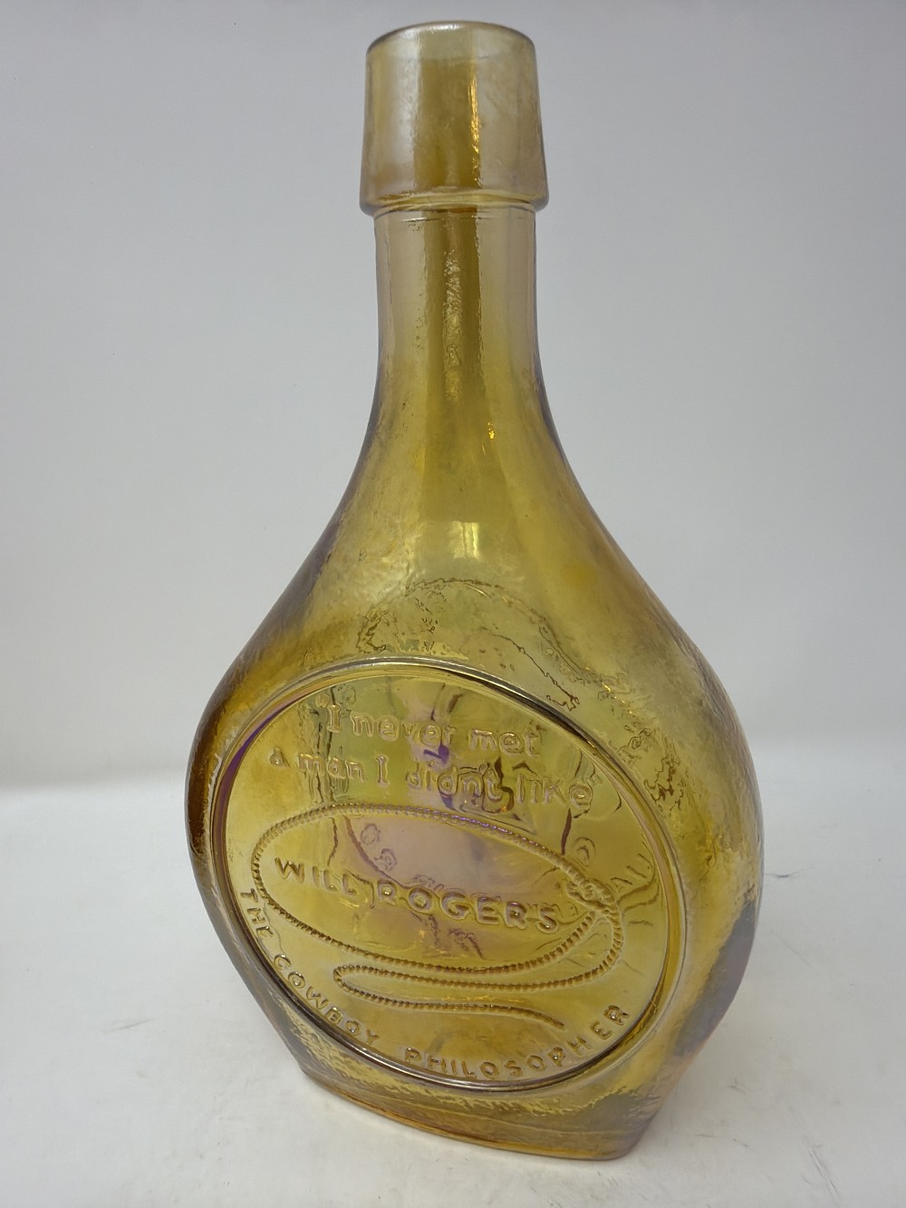 Amber carnival glass bottle by Wheaton featuring raised portrait of Will Rogers and commemorative lettering.