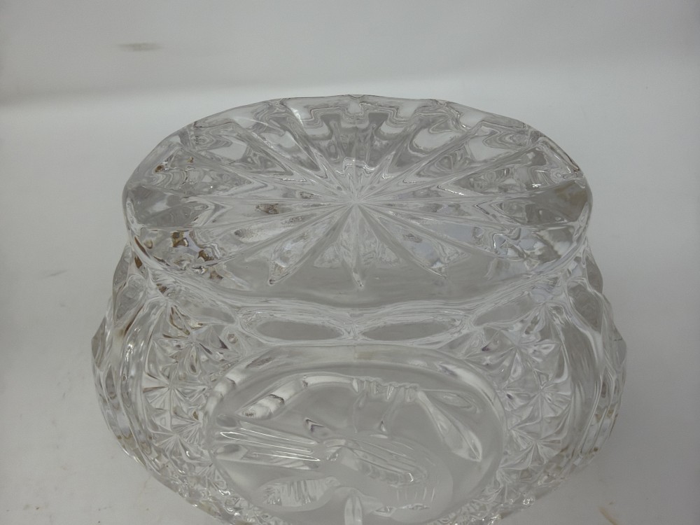 Pressed crystal bowl in the Byrdes pattern by Hofbauer, featuring bird motif and starburst cut detail. Approx. 4.25” H