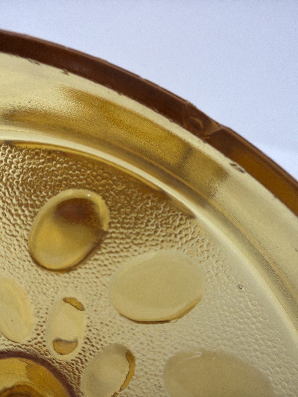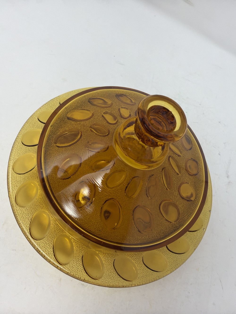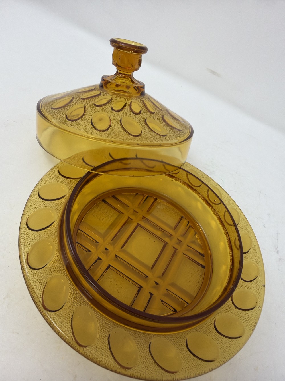 Pressed amber glass covered dish with matching lid. Minor flea bites consistent with age.