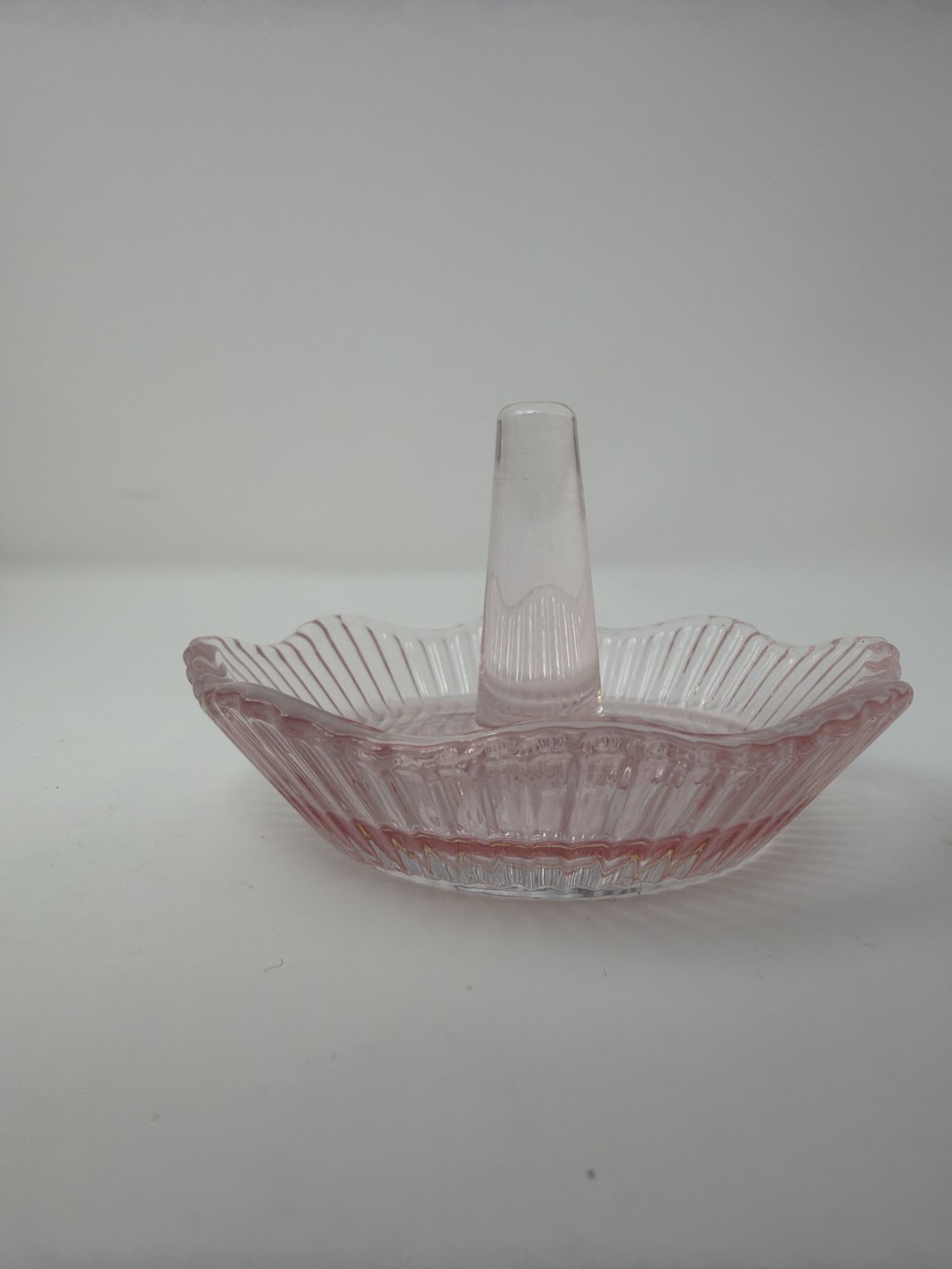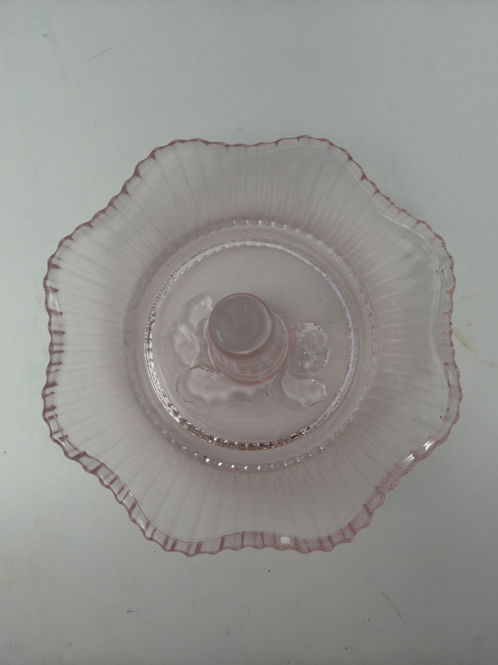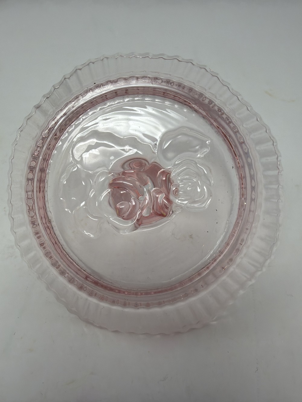 Pink Ribbed Cabbage Rose Embossed Scalloped Glass Ring Holder; approx 3.75”