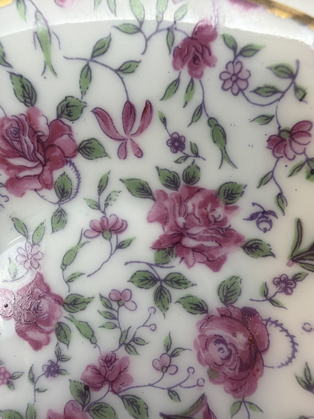 Vintage Chintz Rose Pink Green Gold Rimmed Plate; approx 4.25”; Japan