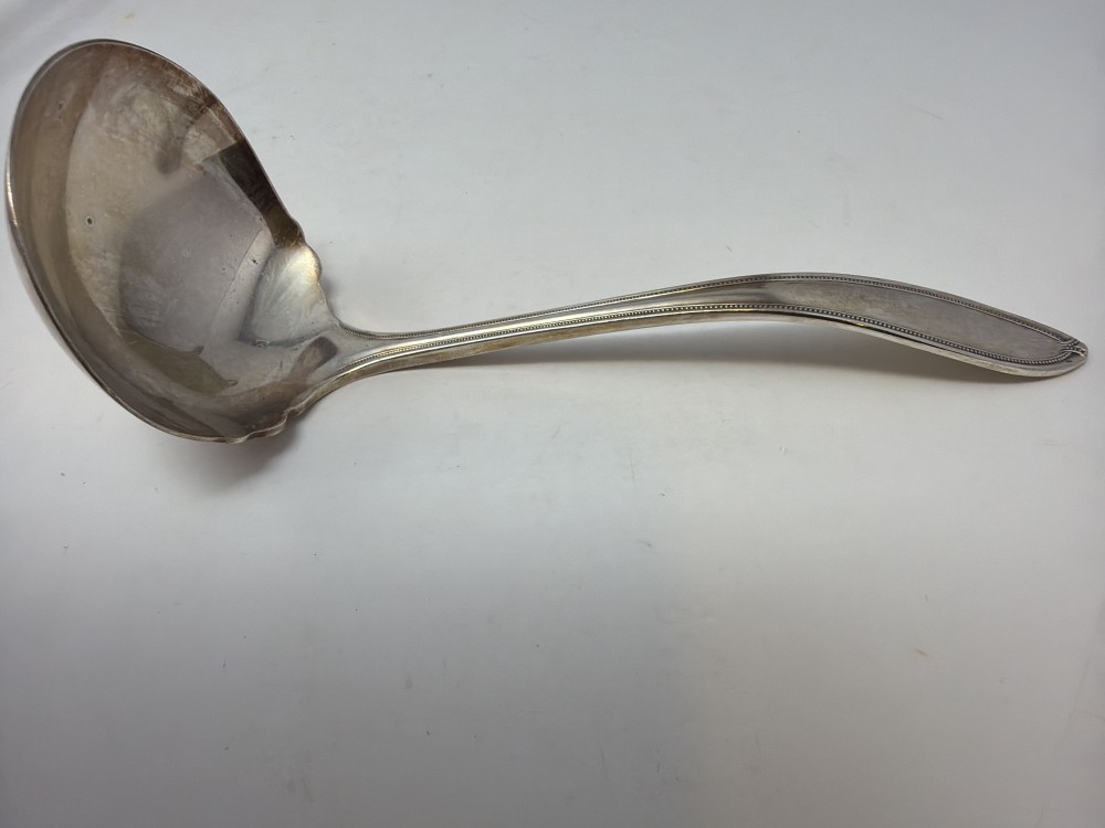 Small silverplate ladle with a clean, classic handle design. A versatile piece for serving sauces, gravies, or dressings, with natural patina from age.