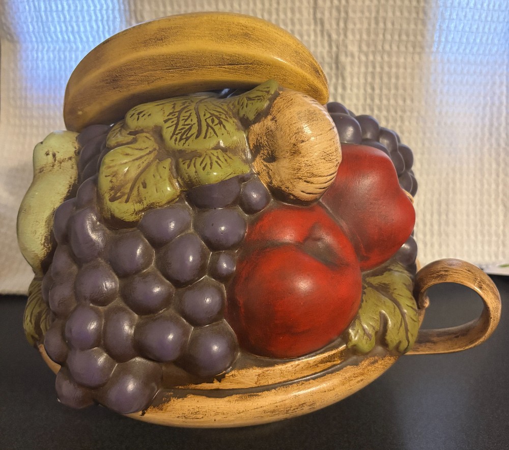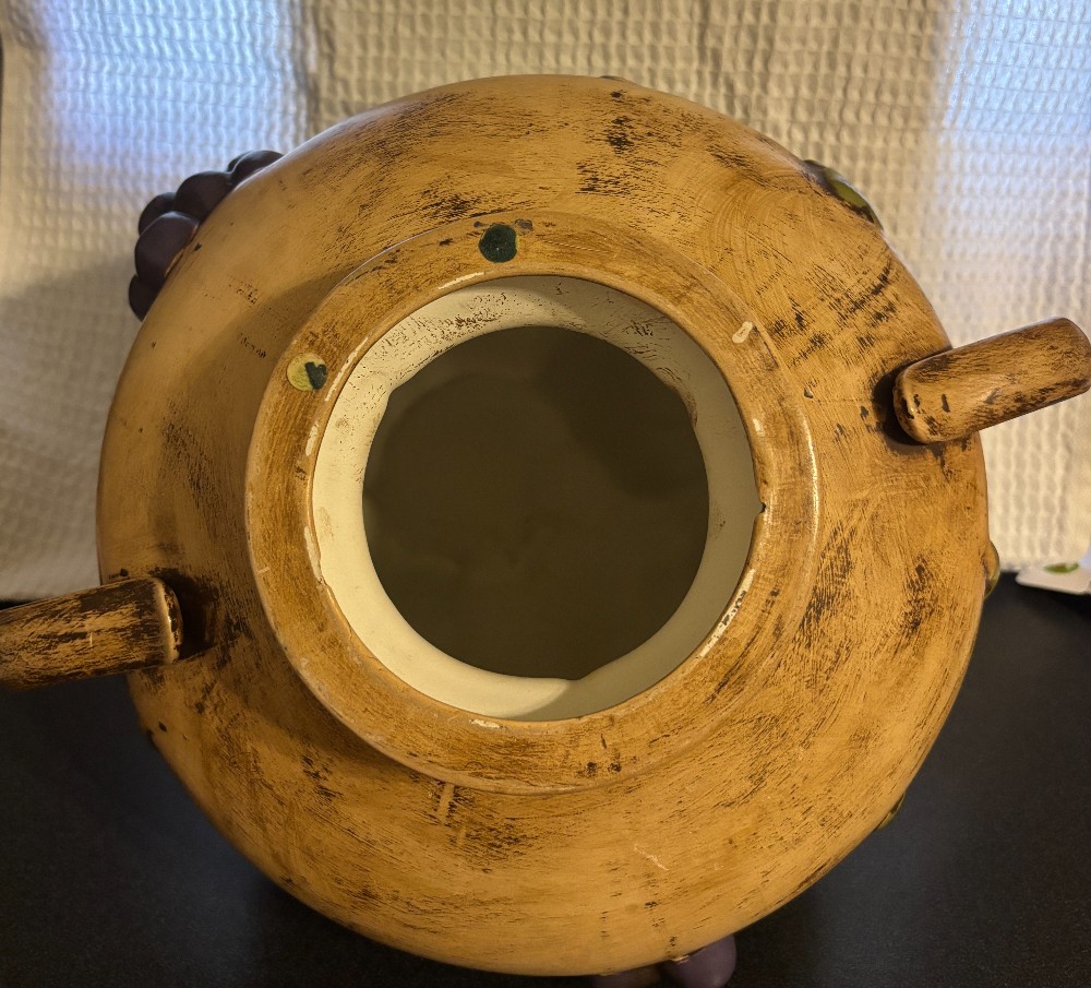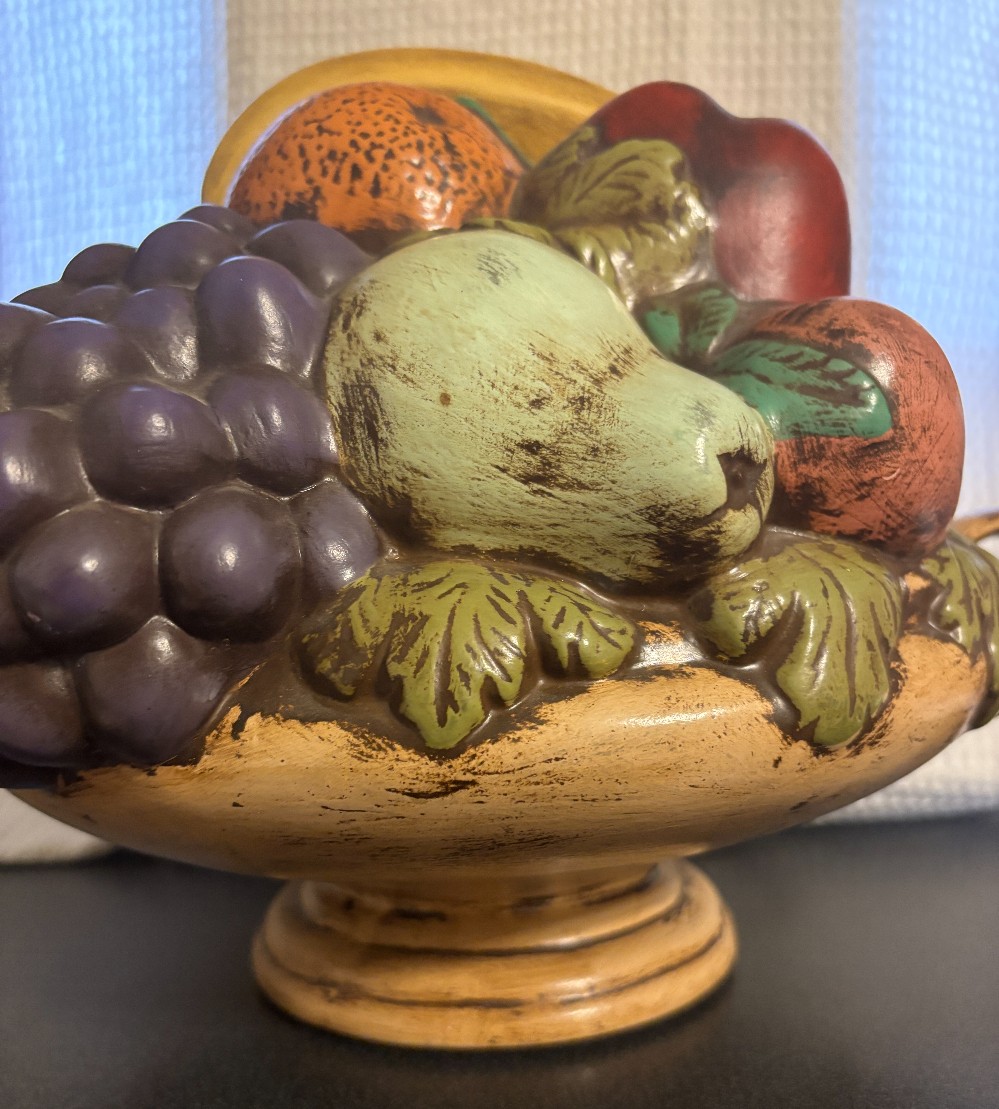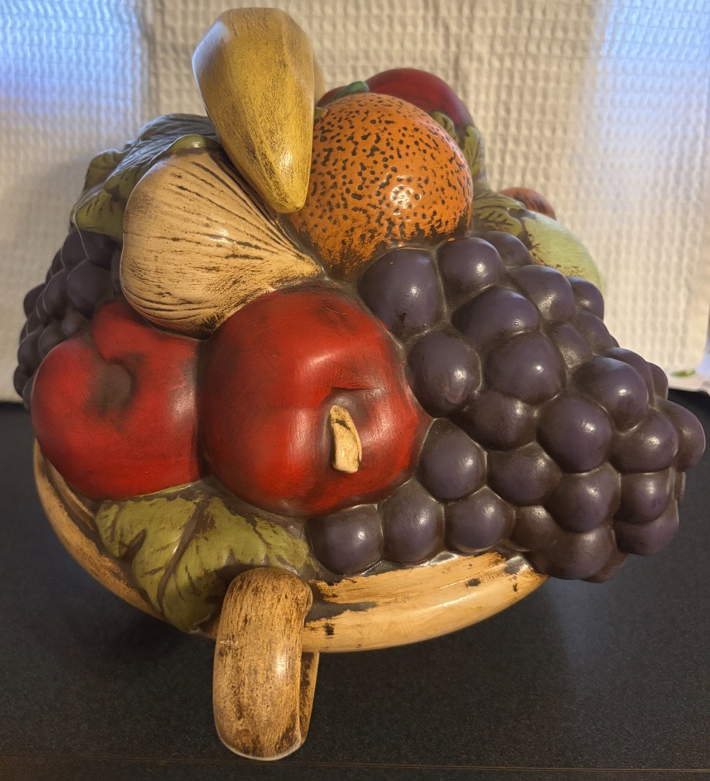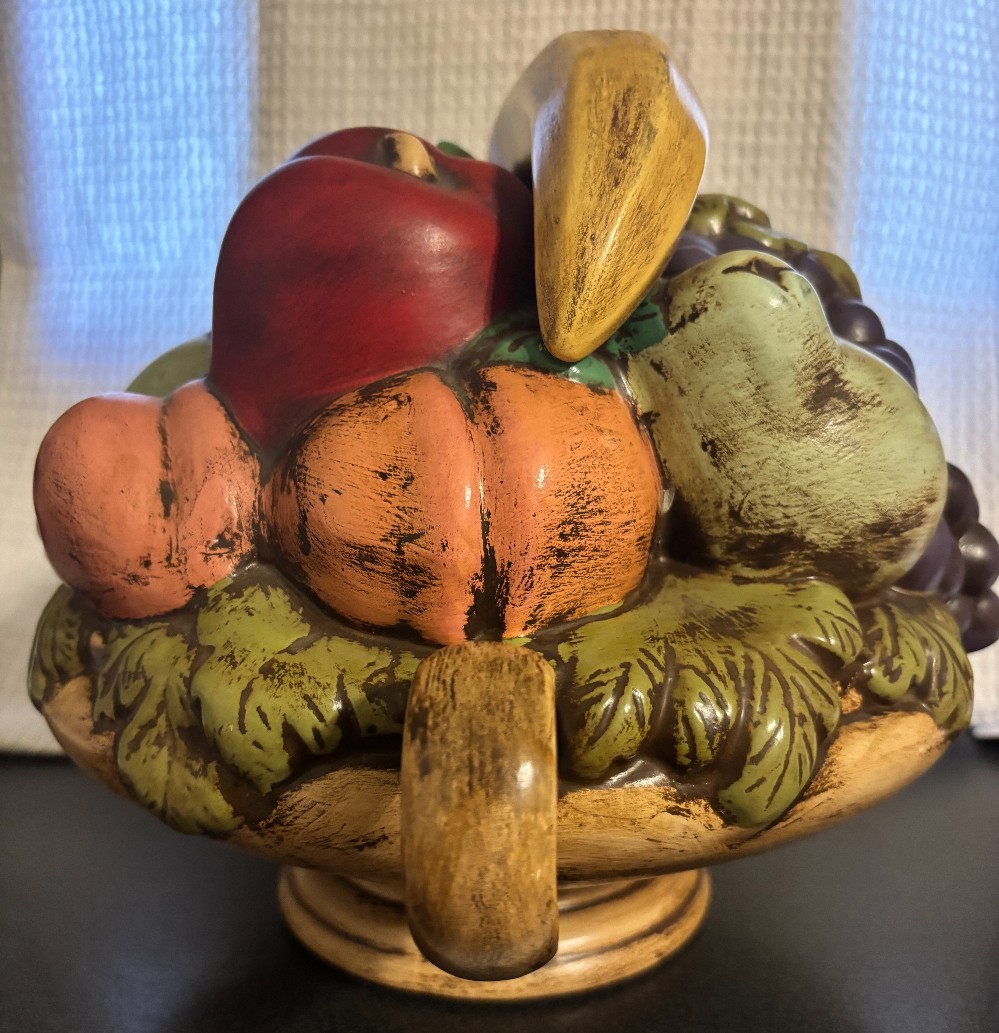 Antiqued low handled tan urn and fruit ceramic one piece centerpiece.9.75"T x 12"W