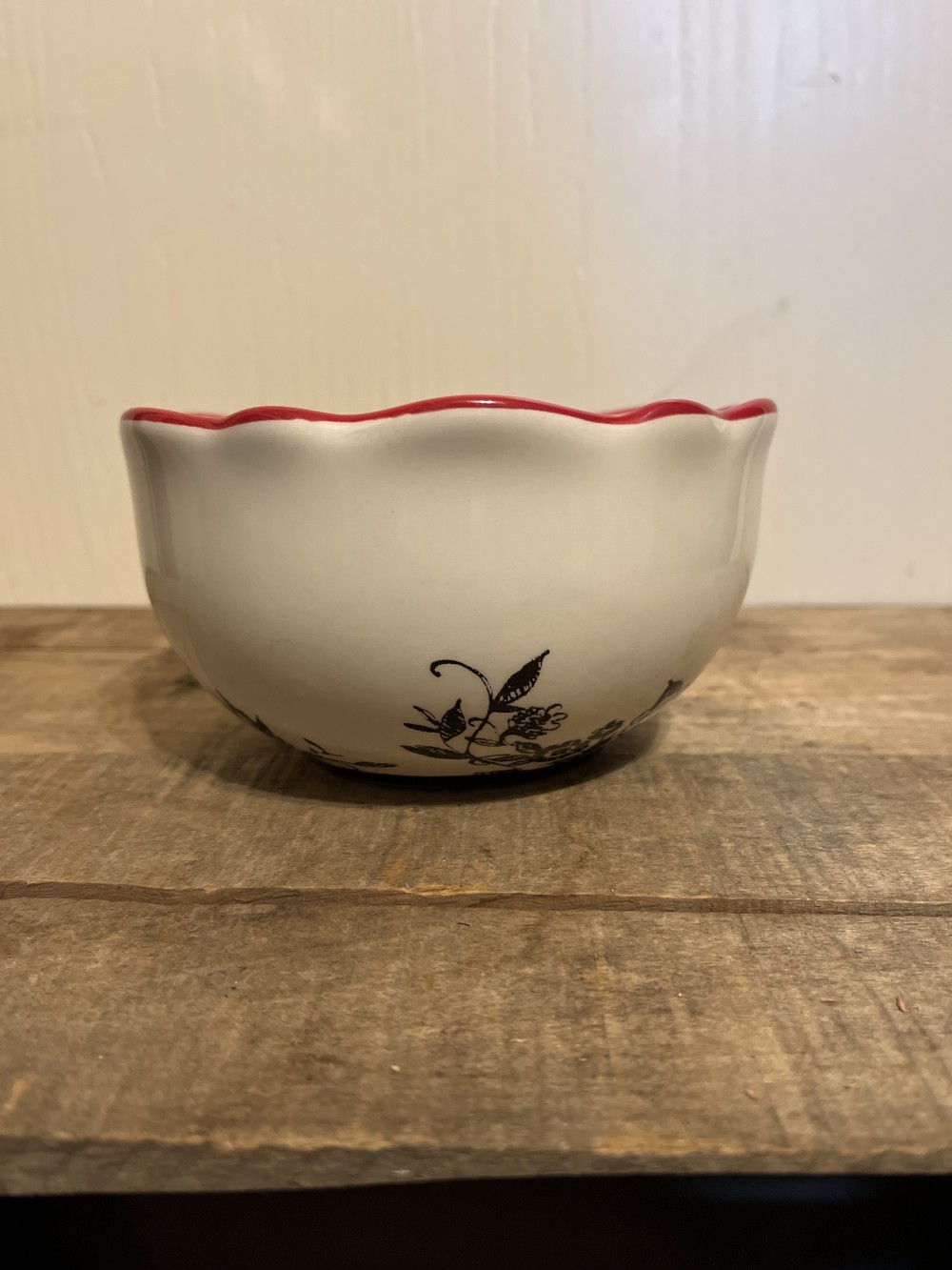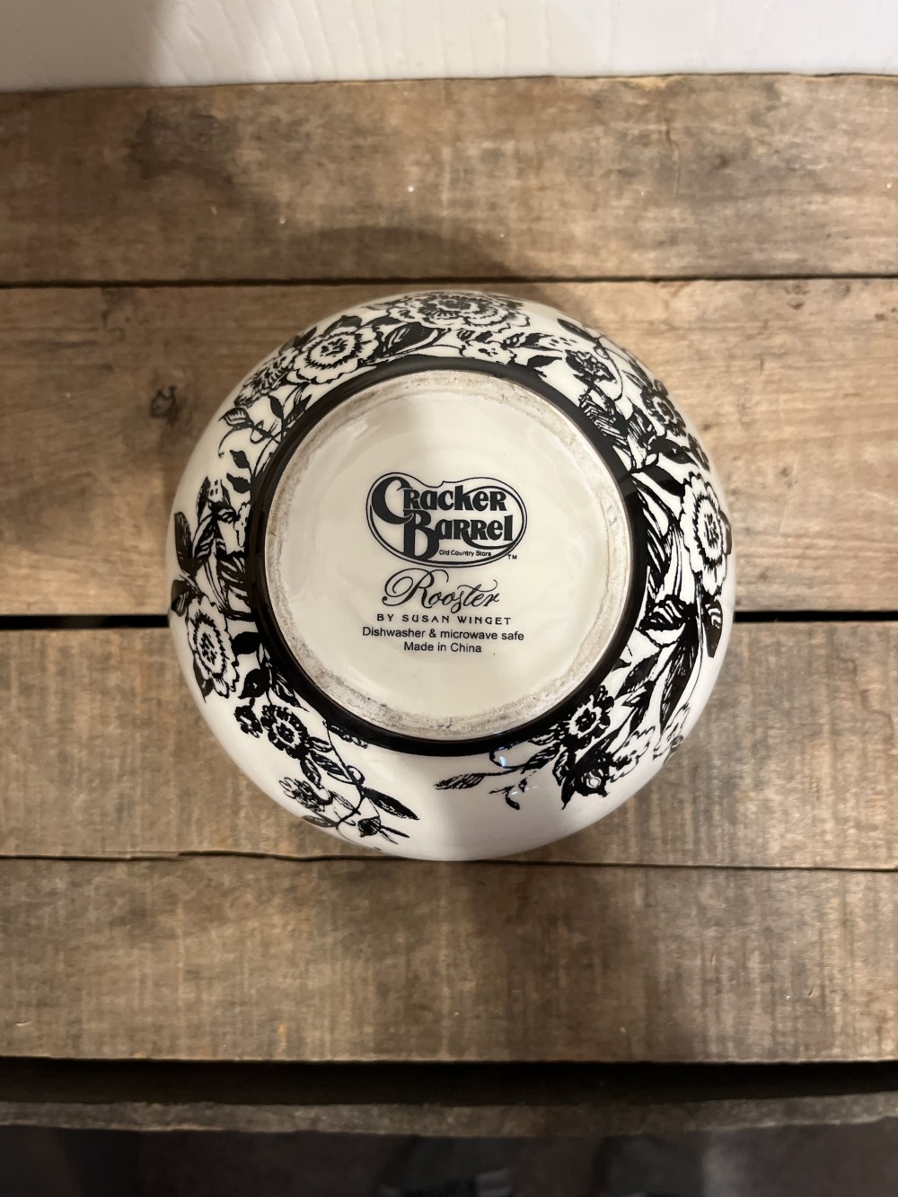 Cracker Barrel Homestead Rooster cereal bowl, designed by Susan Winget. This pattern features a rooster in the bottom of the bowl with a fluted, red rim and black floral pattern around the outside, and was available between 2007 and 2009. This beautiful bowl is in very good condition with no chips or cracks.