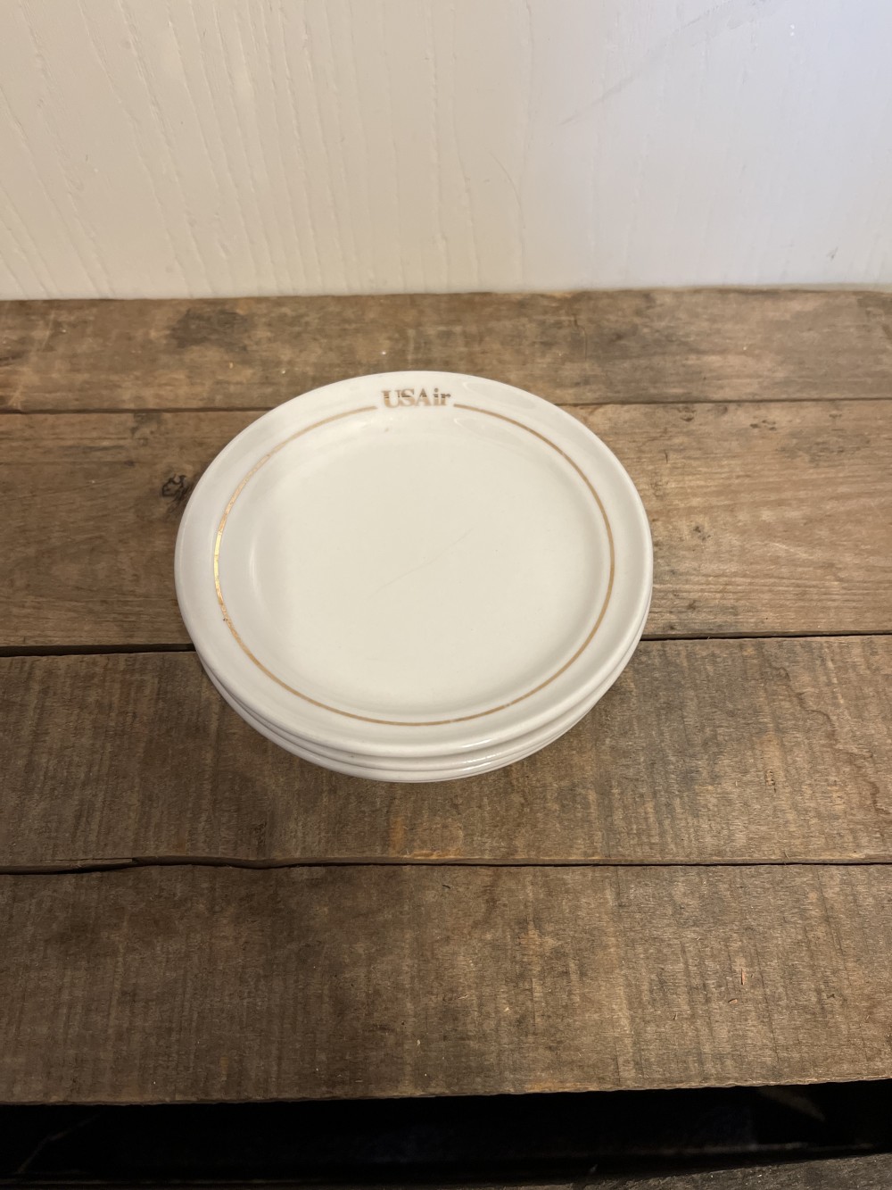 Vintage USAir 5” ironstone bread and butter plate by ABCO. Features gold trim with USAir logo. Very good vintage condition with minor wear on gold trim, no chips or cracks. 4 available.