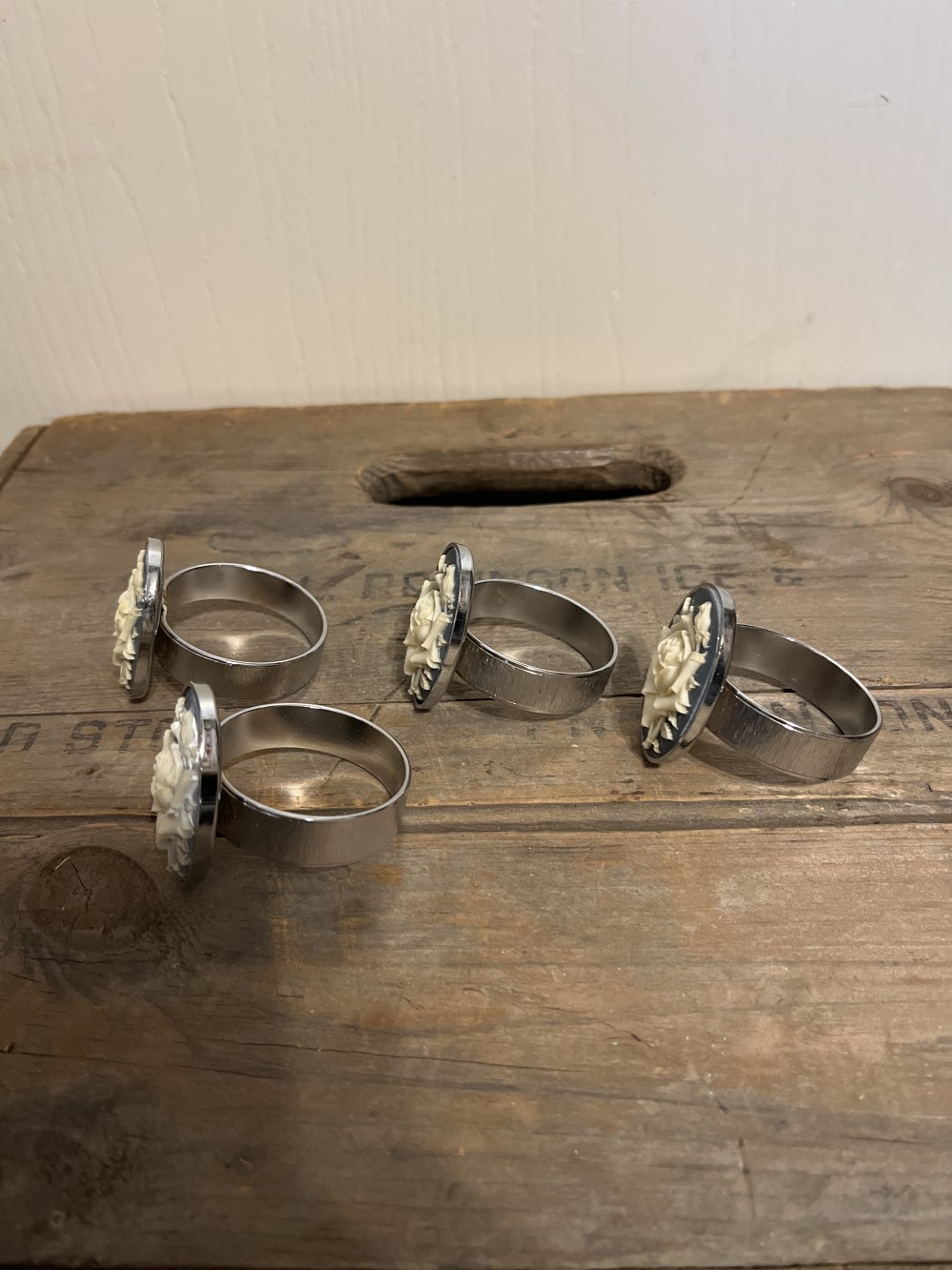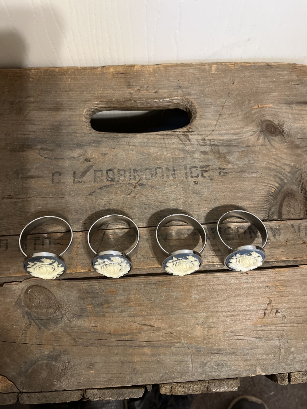 Set of four vintage blue and ivory rose cameo napkin rings, made of Silvertone metal, made in Hong Kong. These lovely napkin rings are preowned in very good condition.