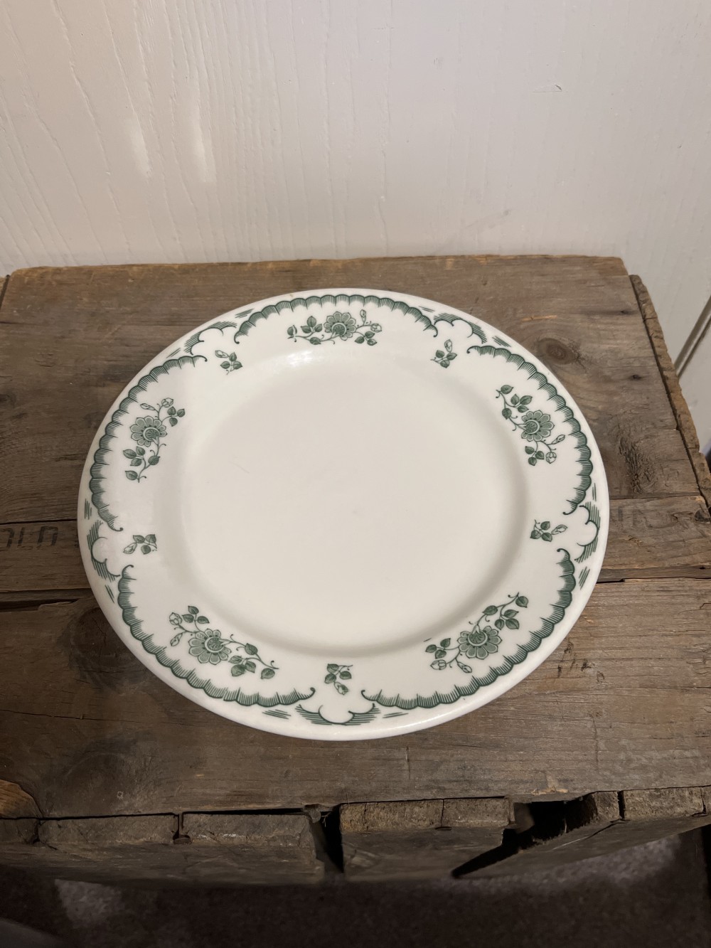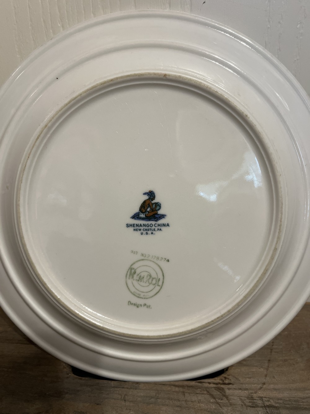 Rare vintage 1930s to 1950s Shenango Green Chardon Rose 9” plate. This heavy duty patented “RimRol” design plate was typically used in restaurants. This plate is preowned in good vintage condition with no chips or cracks. There are utensil scratches on the center of the plate, but no scratches in the beautiful floral design.