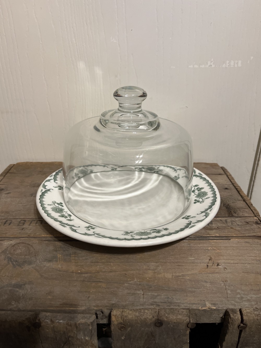 * This plate is the perfect size for a glass cloche, as seen in one of the photos. The cloche is 6 3/8” in diameter, not included.