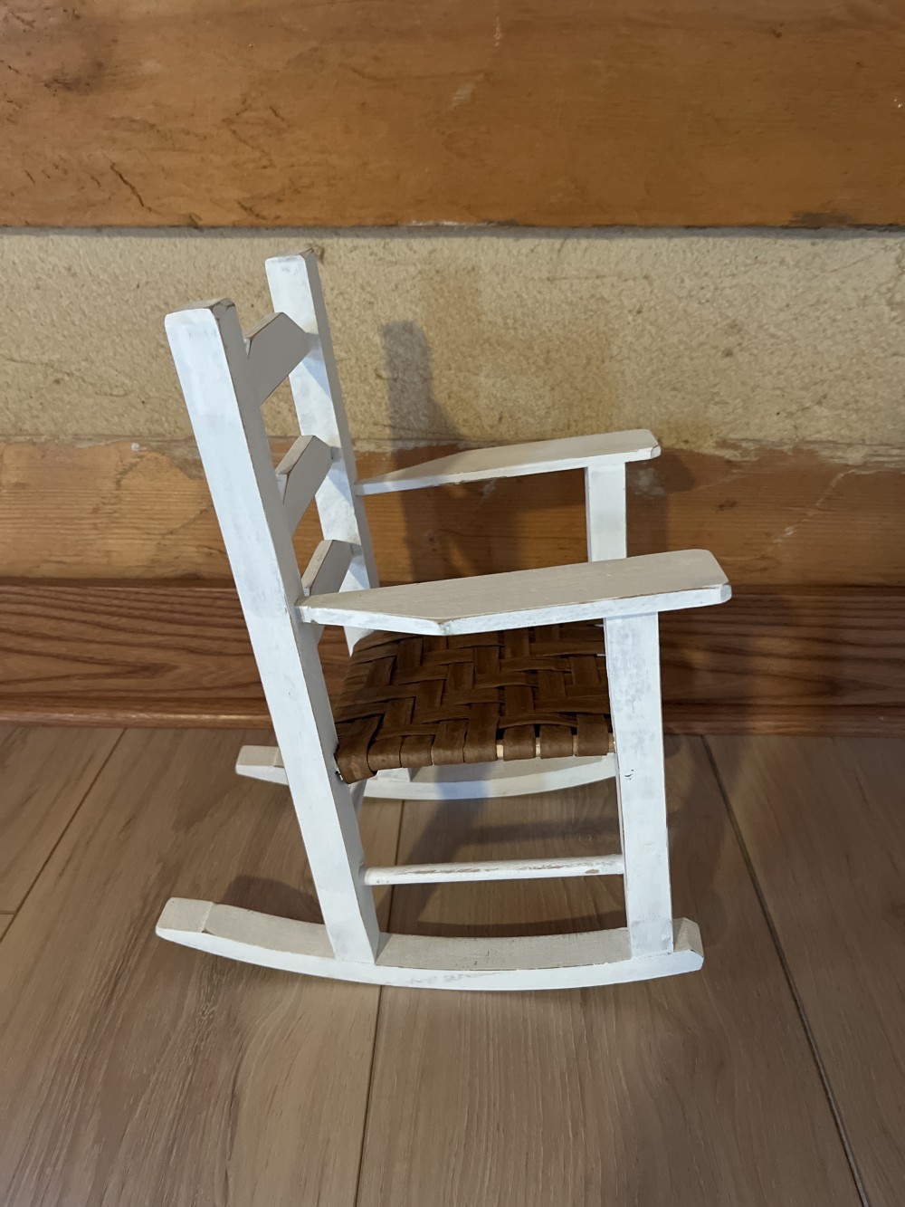 Vintage wood doll rocking chair with woven seat. Painted white and lightly distressed, very good condition. Measures approximately 12.5” tall x 8” wide x 10” deep at base, arms are 5” apart.