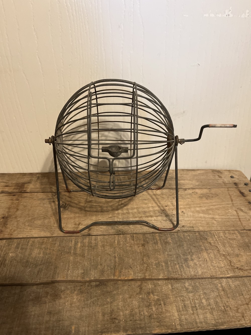 Vintage metal wire, bingo cage, no balls included. Handle turns freely and rear door opens and closes well. Metal ball cup spins freely and will hold 1/2 inch wooden or plastic balls. A rare find! Measures approximately 7 inches tall and cage is 5 inches in diameter. Very good vintage condition with aged patina with minor surface rust in some places