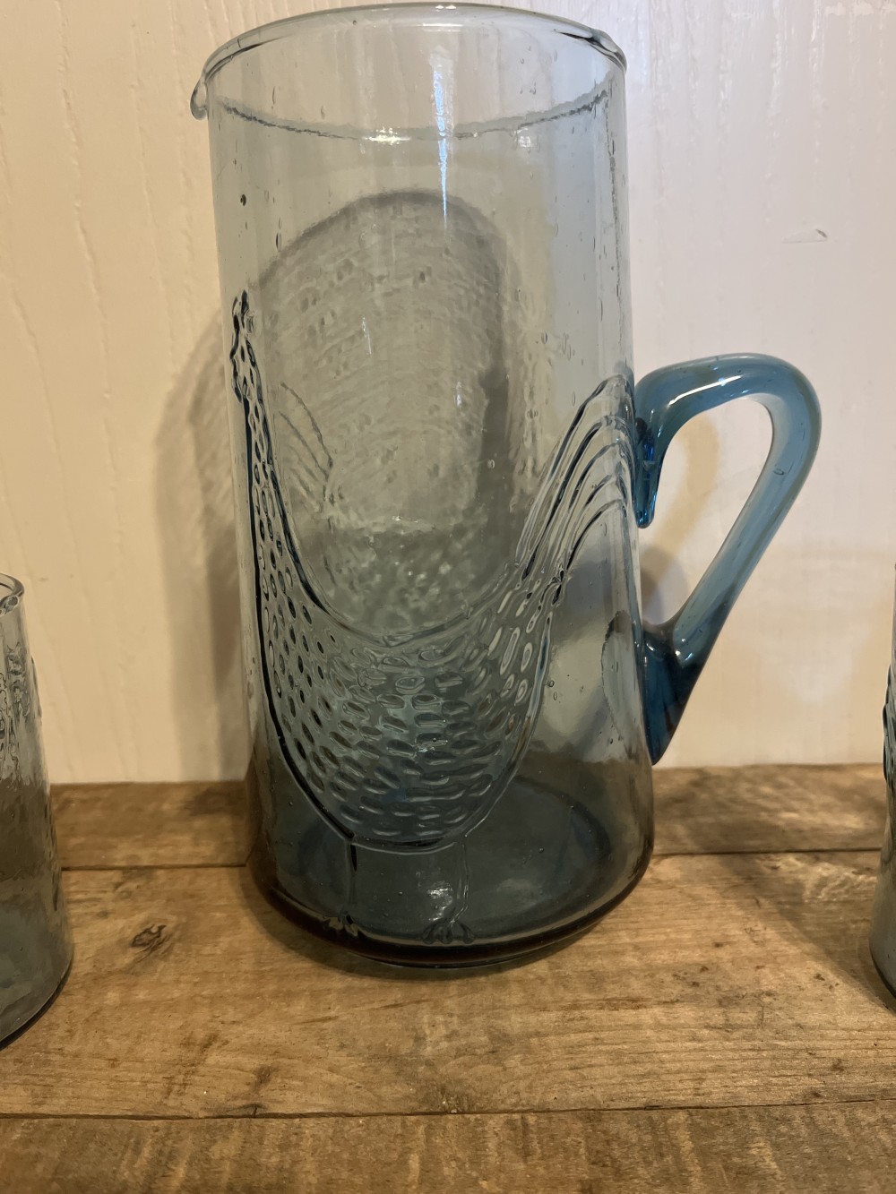 Beautiful hand blown blue glass pitcher with two matching glasses, featuring a rooster design, made in Italy. The glass features bubbles and slight imperfections that add character and uniqueness to these handmade items. There are no chips or cracks. Pitcher is approximately 9” tall and glasses are 4” tall.