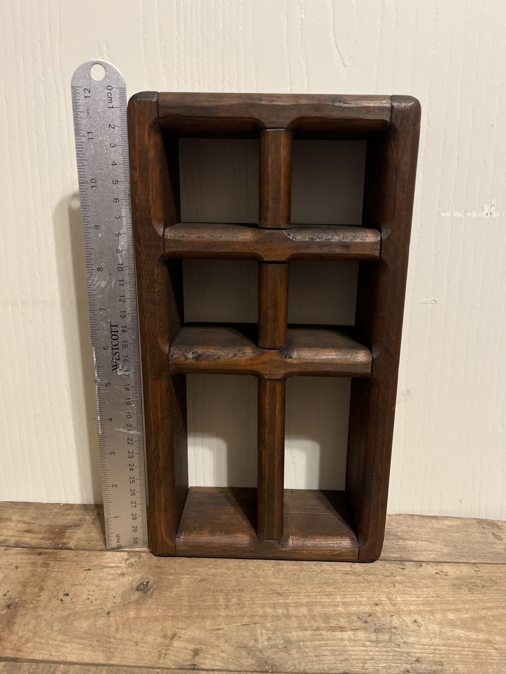 Handmade wood trinket shelf or shadowbox. Measures approximately 12” tall x 6.5 wide.