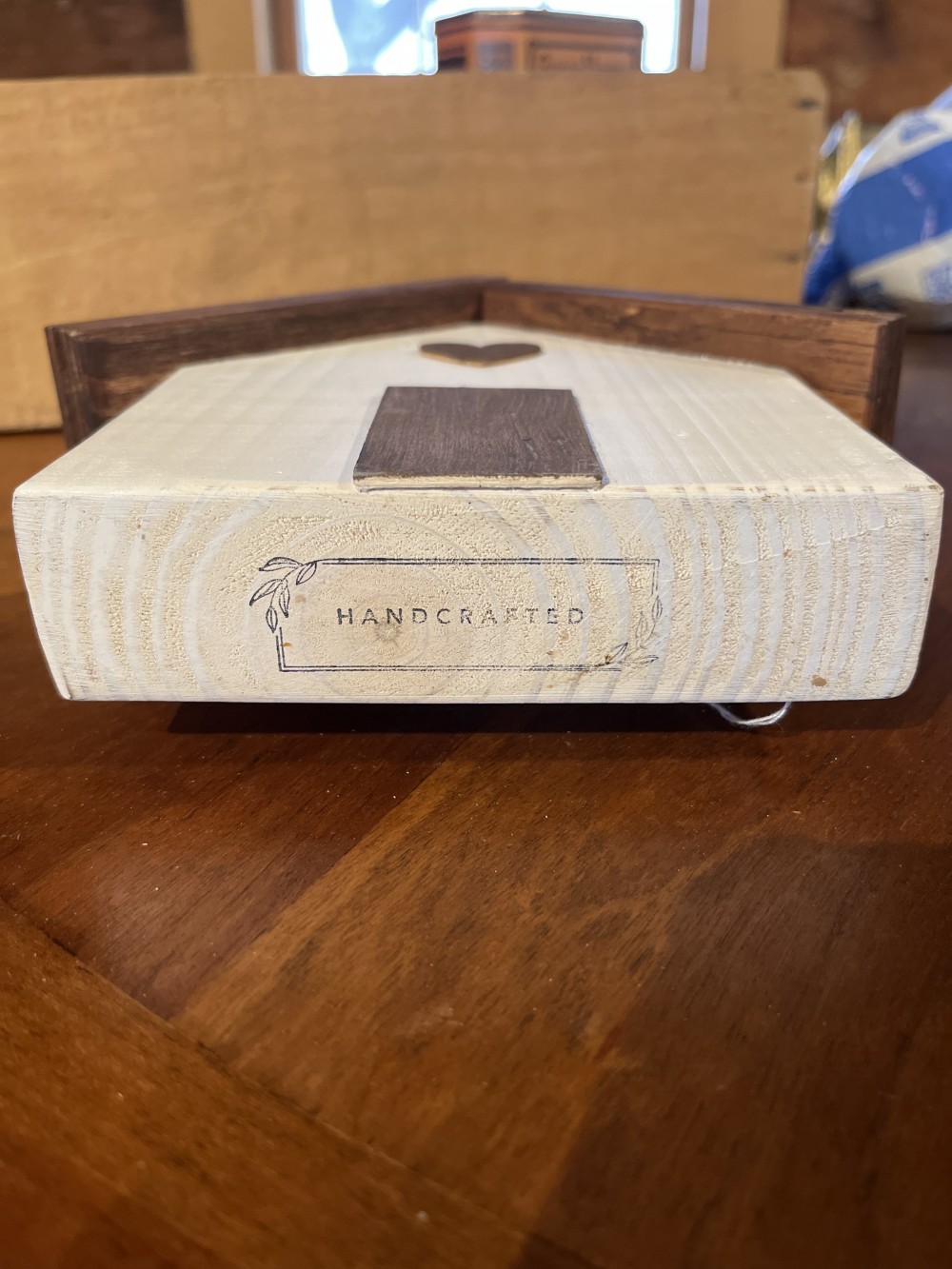 Handmade wood house, painted white with stained wood roof, door and heart. Measure 7“ x 7“