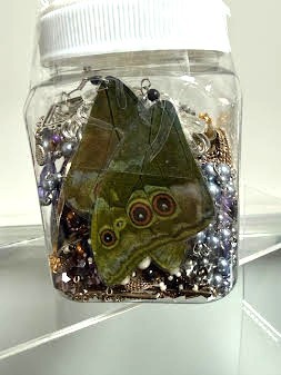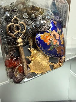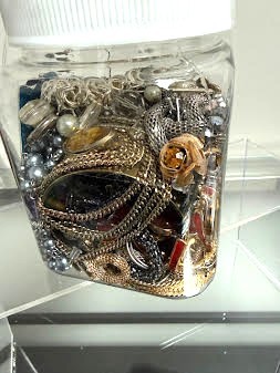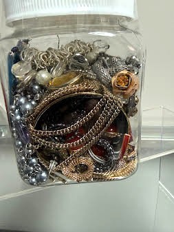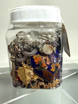 20+ Pieces of mixed jewelry. All jewelry is wearable. This is a fun jar for sure! There are necklaces, bracelets, rings, and earrings. There is a beautiful big blue cloisonee heart to boot!
