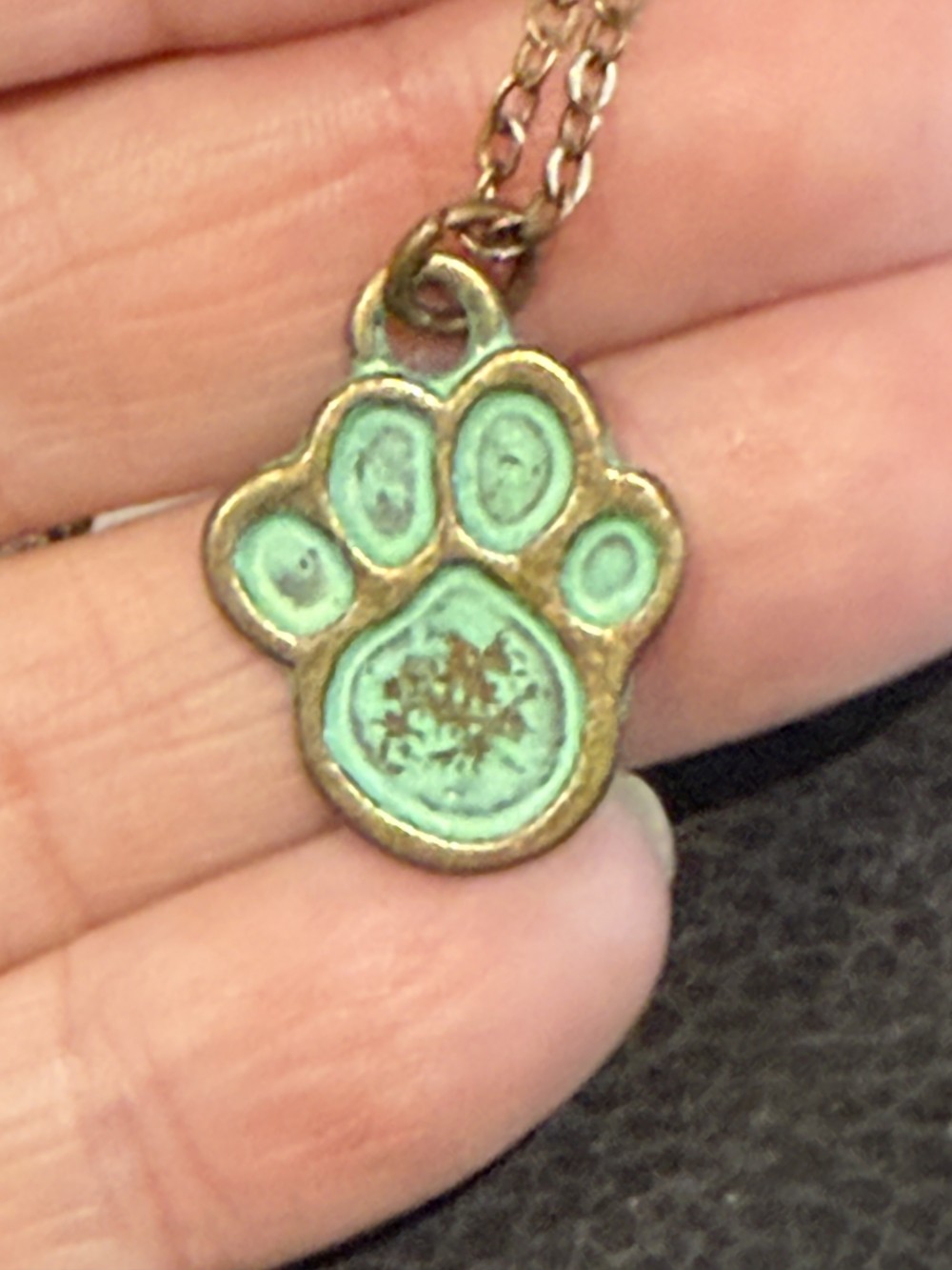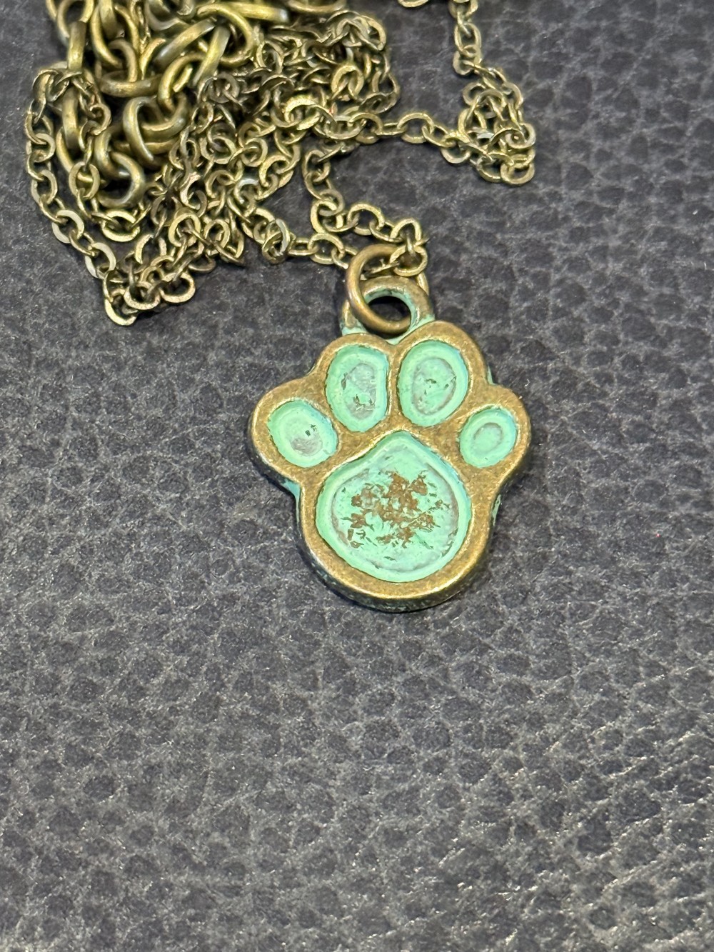 pendant necklace - a green patina paw on a bronze chain that is 16 inches with a three inch extension