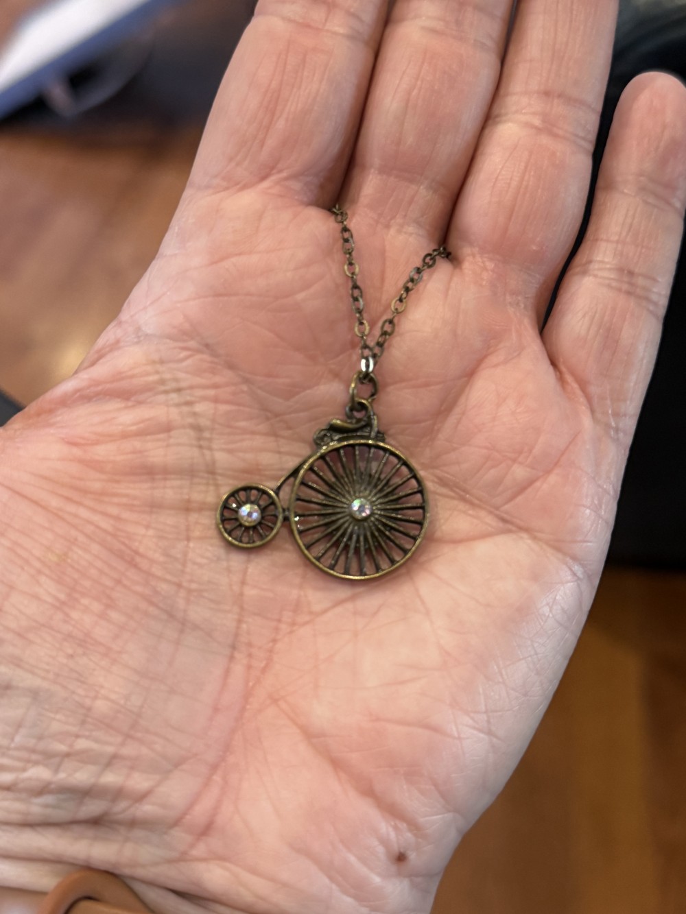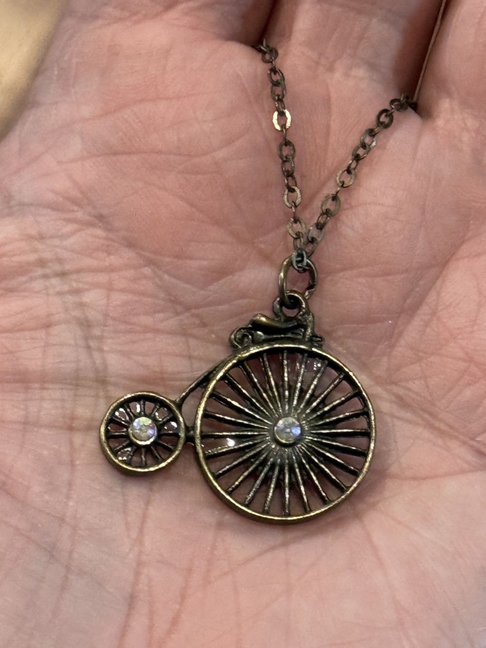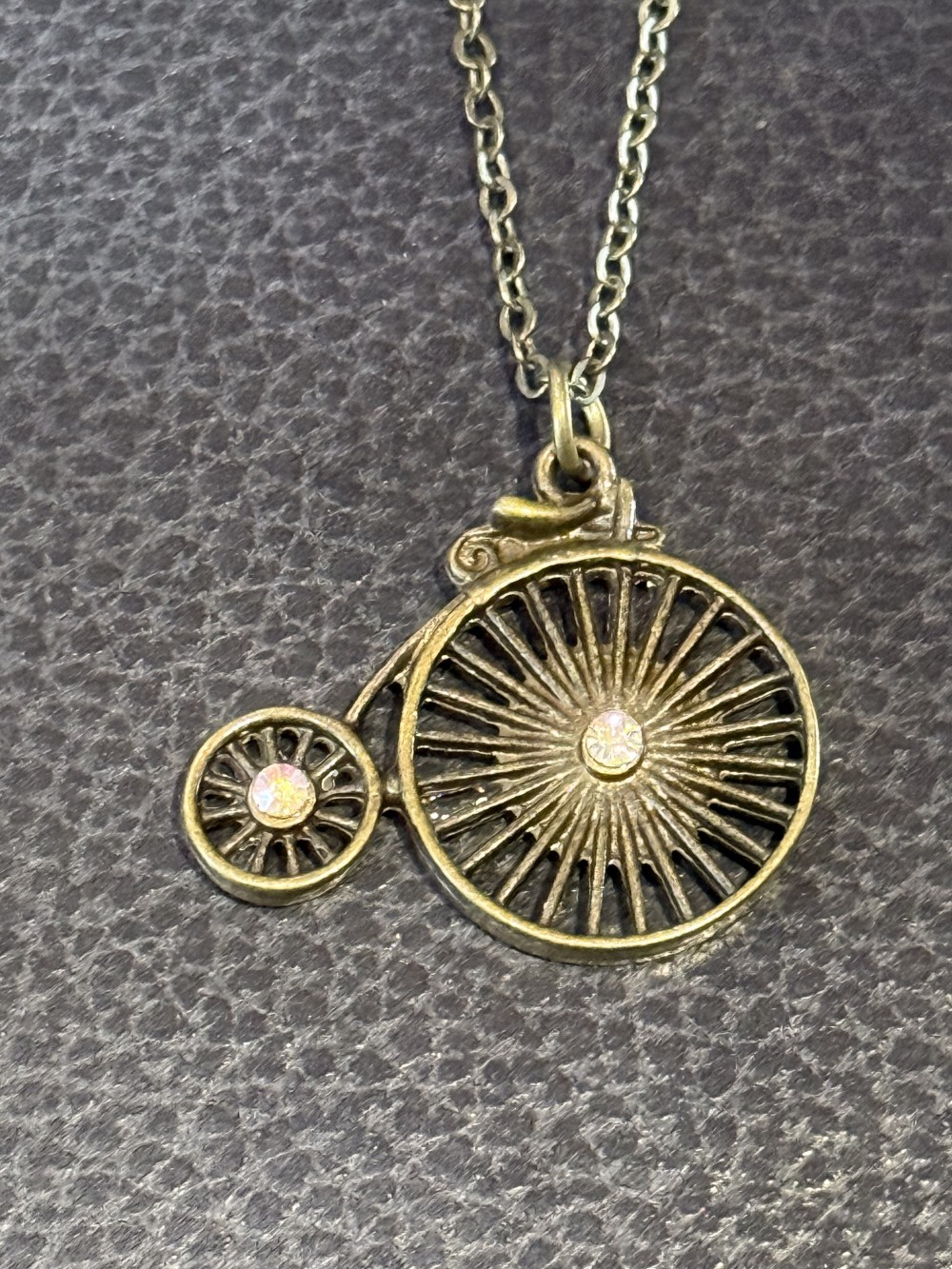 Pendant of an antique bike with rhineston accent with bronze tone chain that is 20 inches long