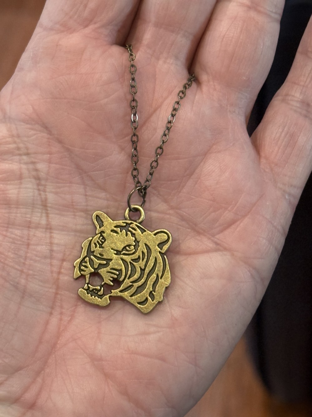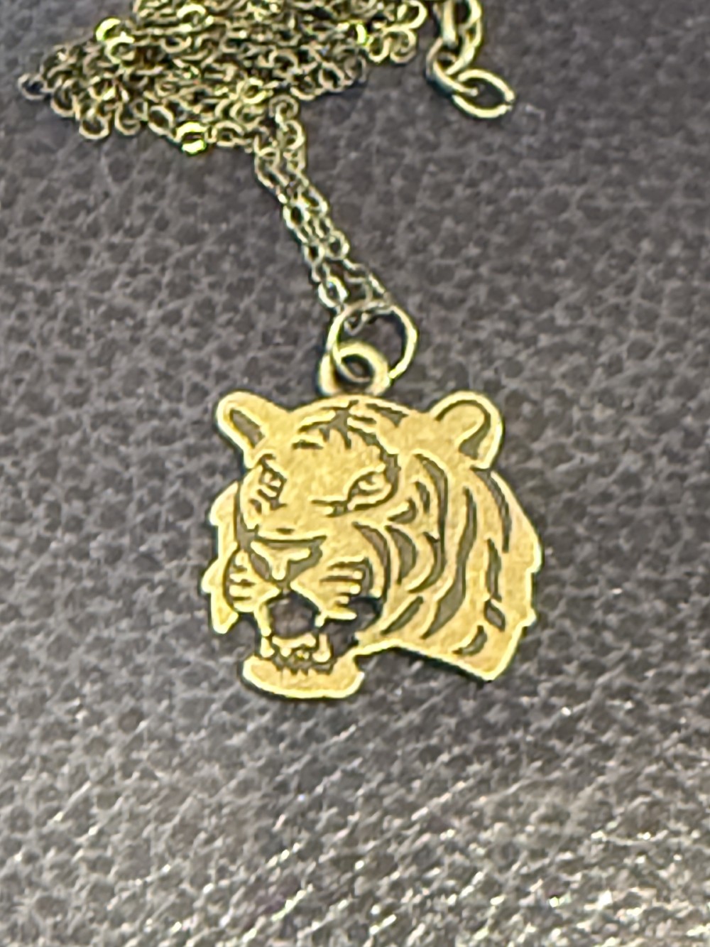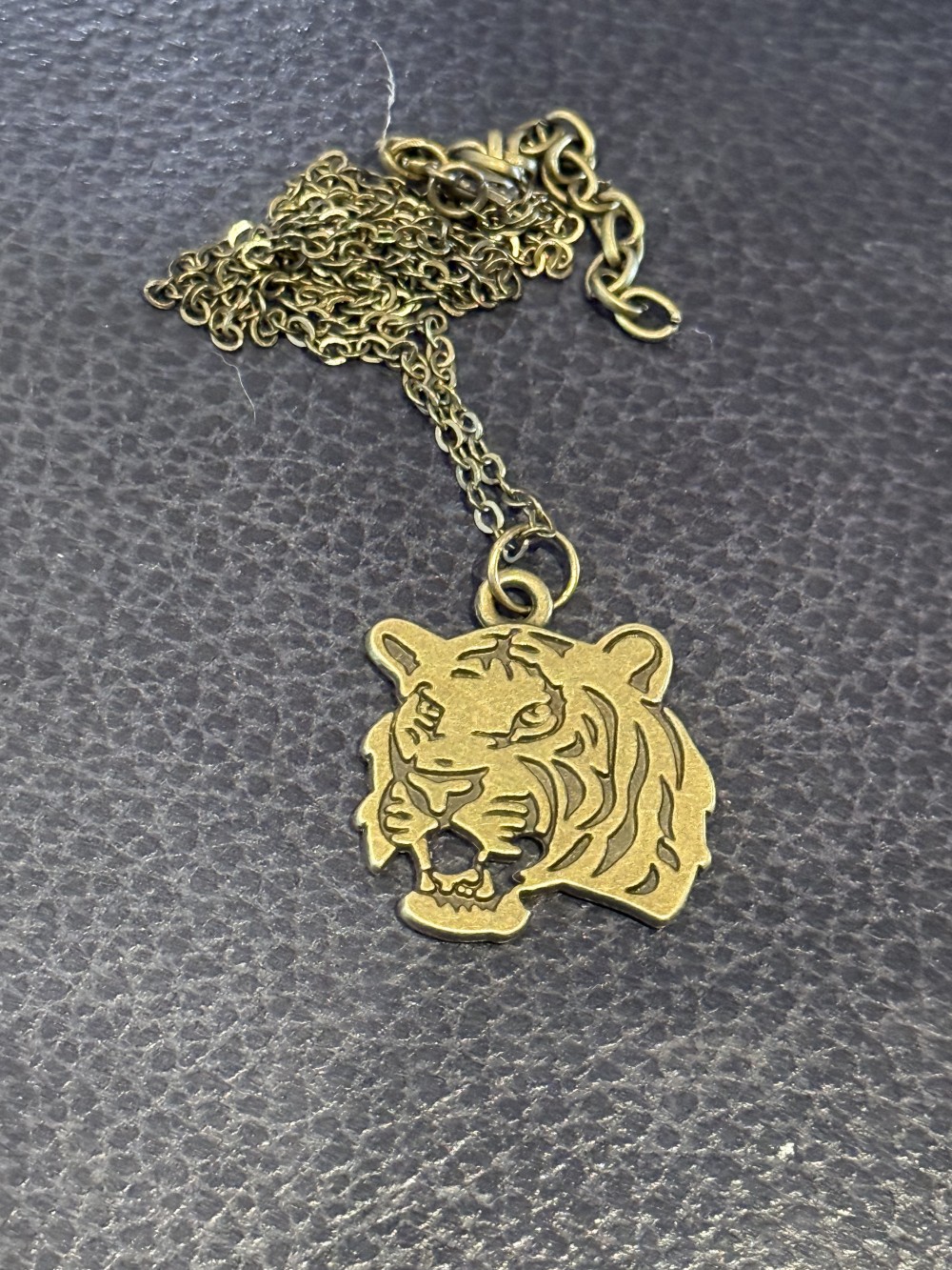 Pendant of a bronze tiger face with a bronze toned 18 inch chain. Clemson or LSU.