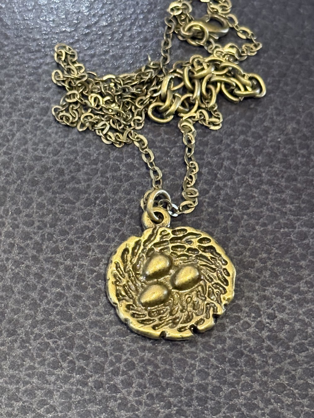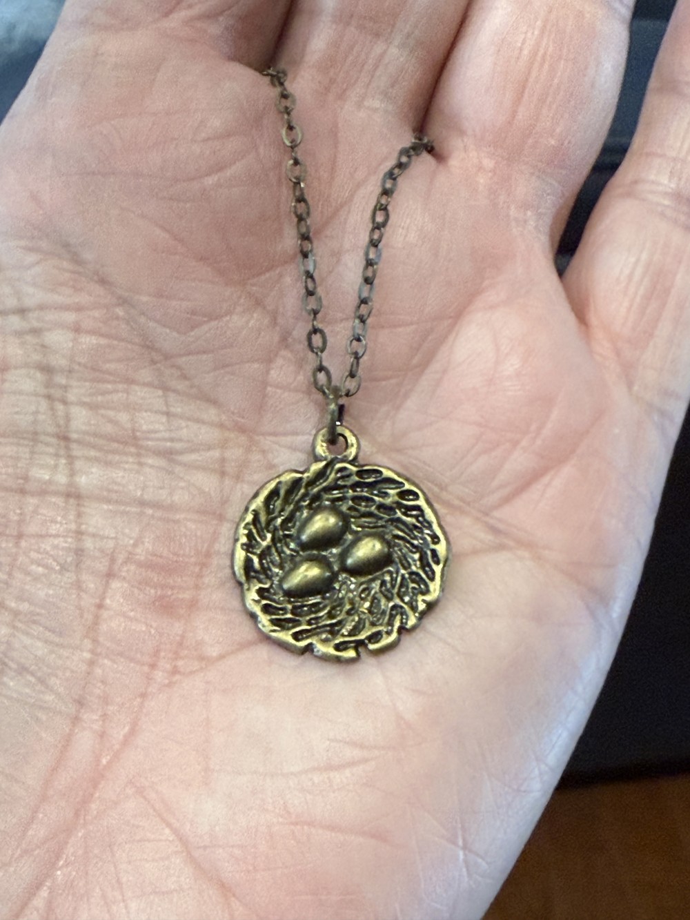 Pendant Necklace - bronze tone bird nest with three eggs hanging on a bronze tone 18 inch chain and two inch extension