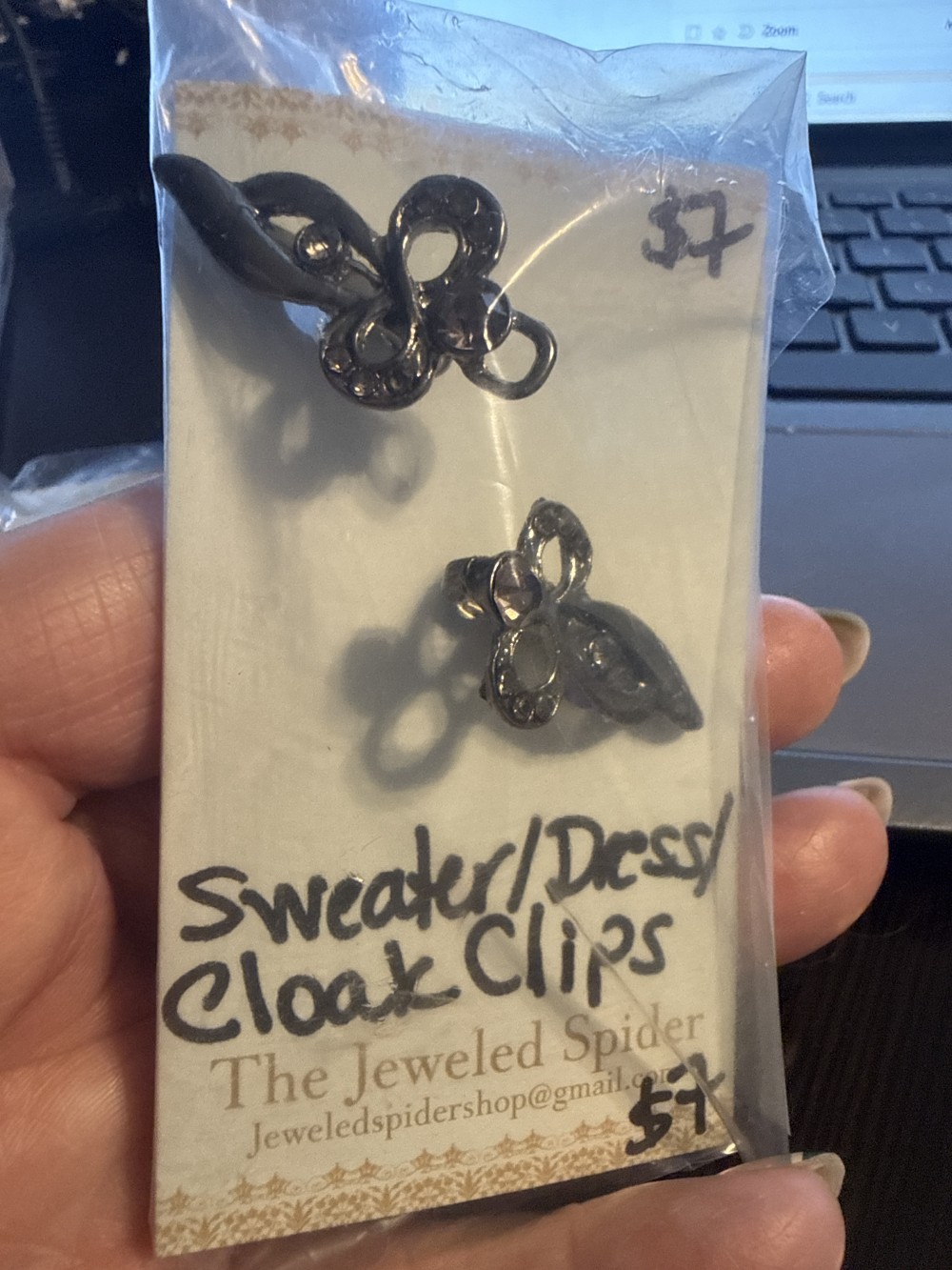 Sweater Clips with alligator style clips on the back and rhinestone accents. Available in two colors
