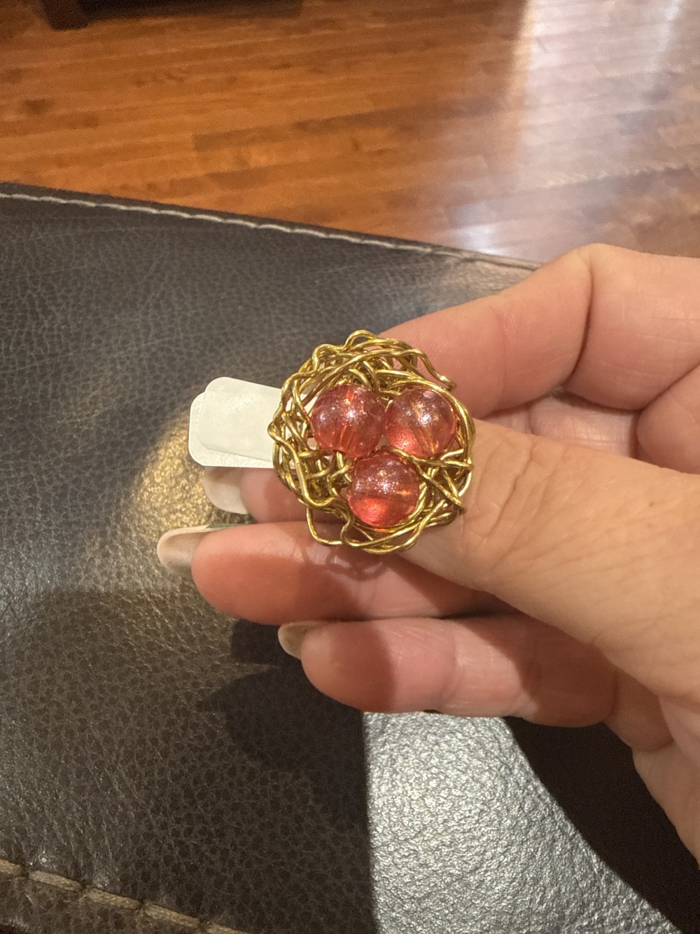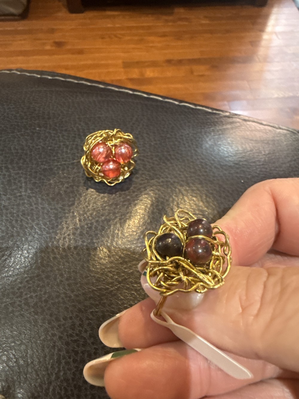 Gold wire wrapped rings with three beads as the bird eggs.