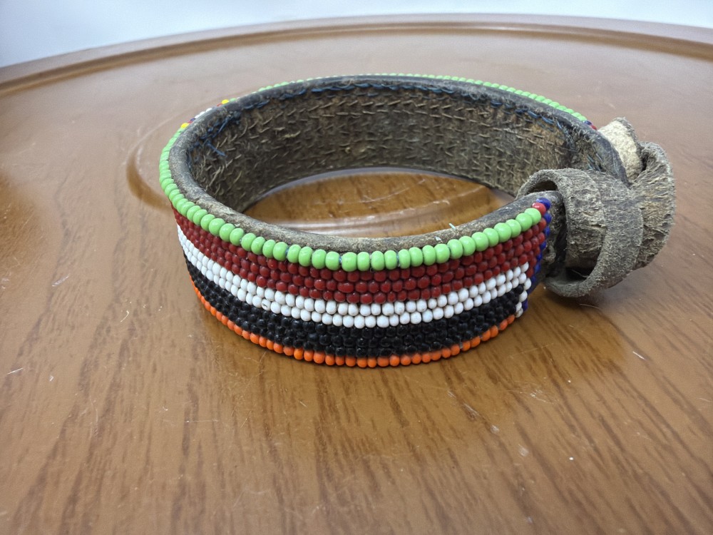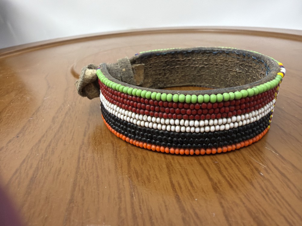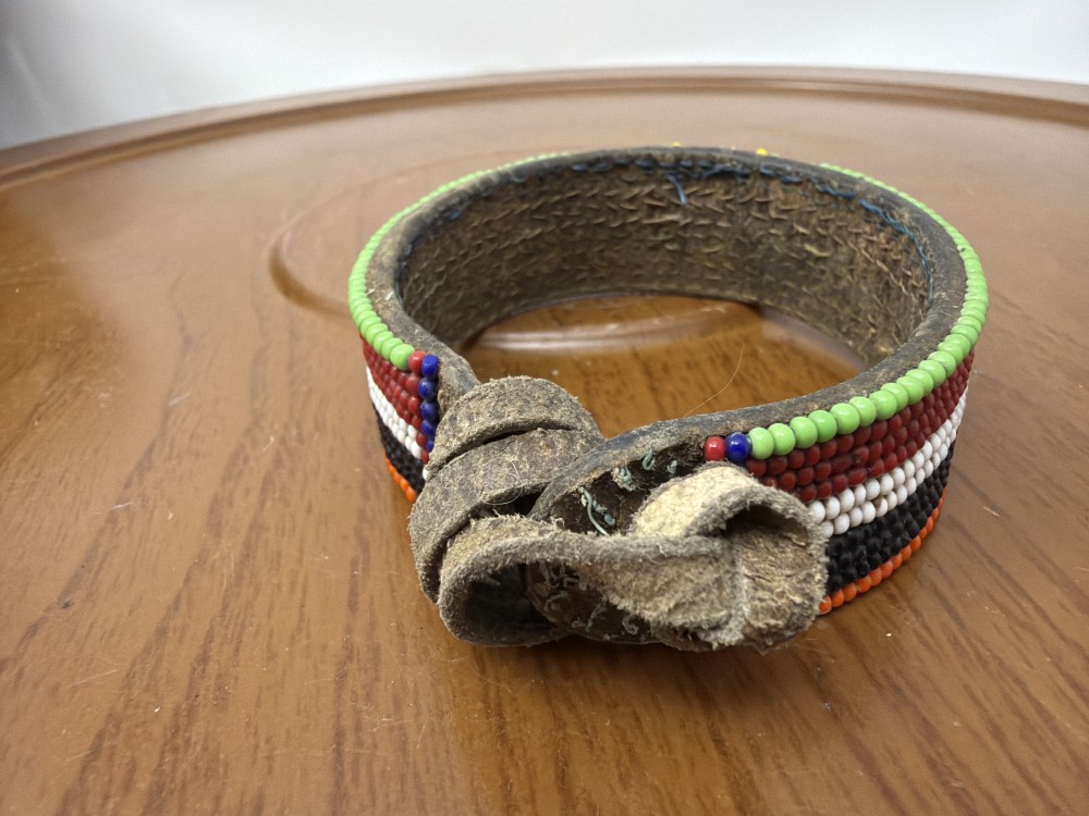 Colorful glass beadwork on leather with geometric pattern. Handmade style with a well-worn, authentic feel.