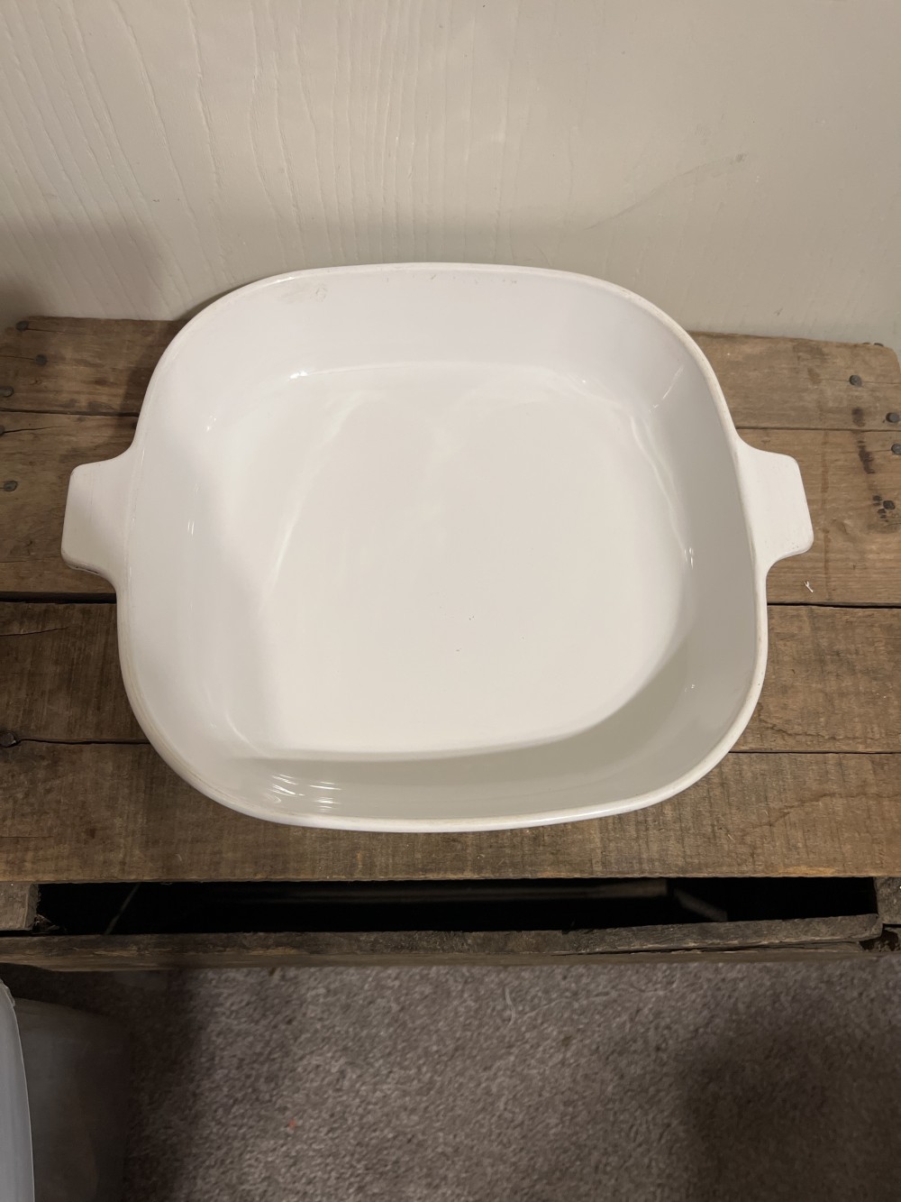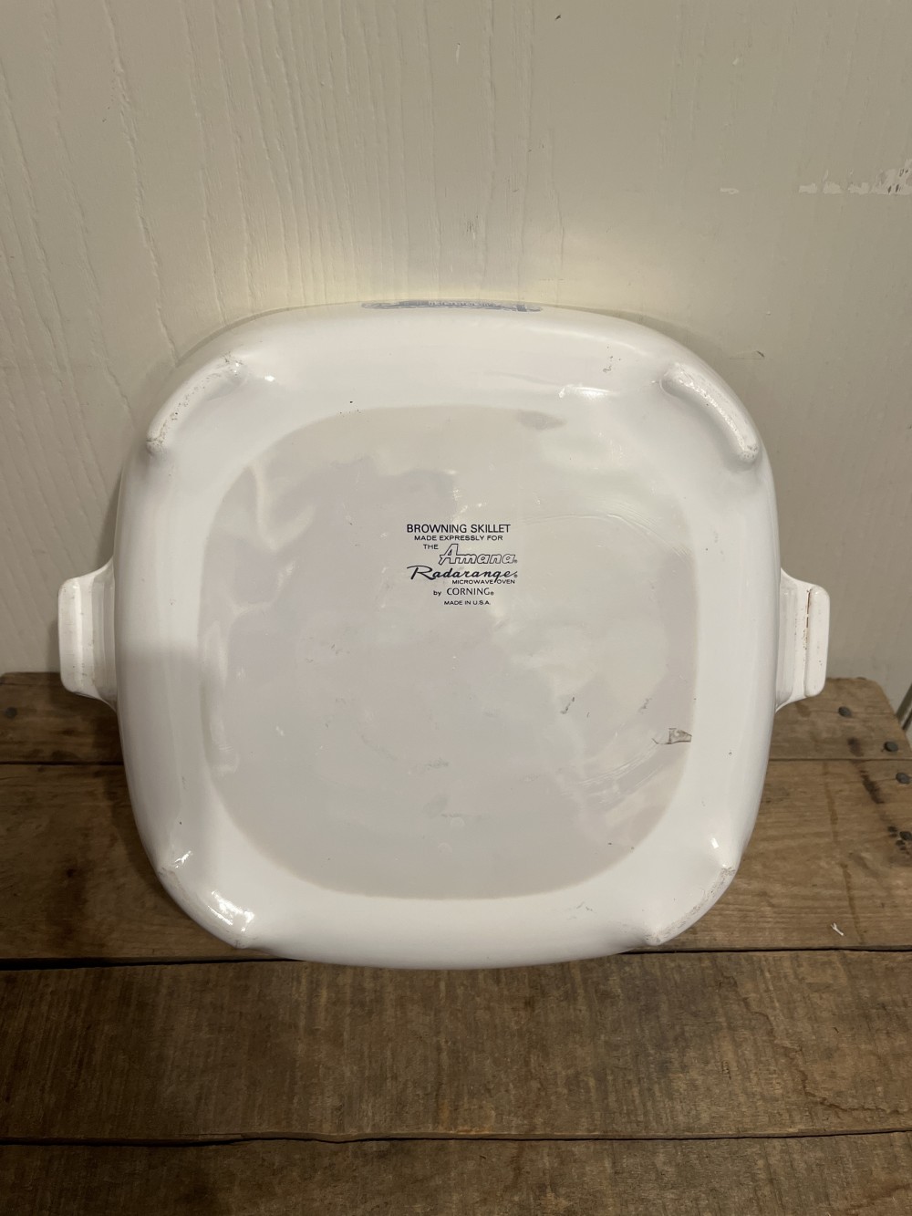 This is a vintage Corning Ware Amana Radarange 10-inch browning skillet or casserole dish with the blue Colonial House pattern. Made in the U.S.A. Very good condition!