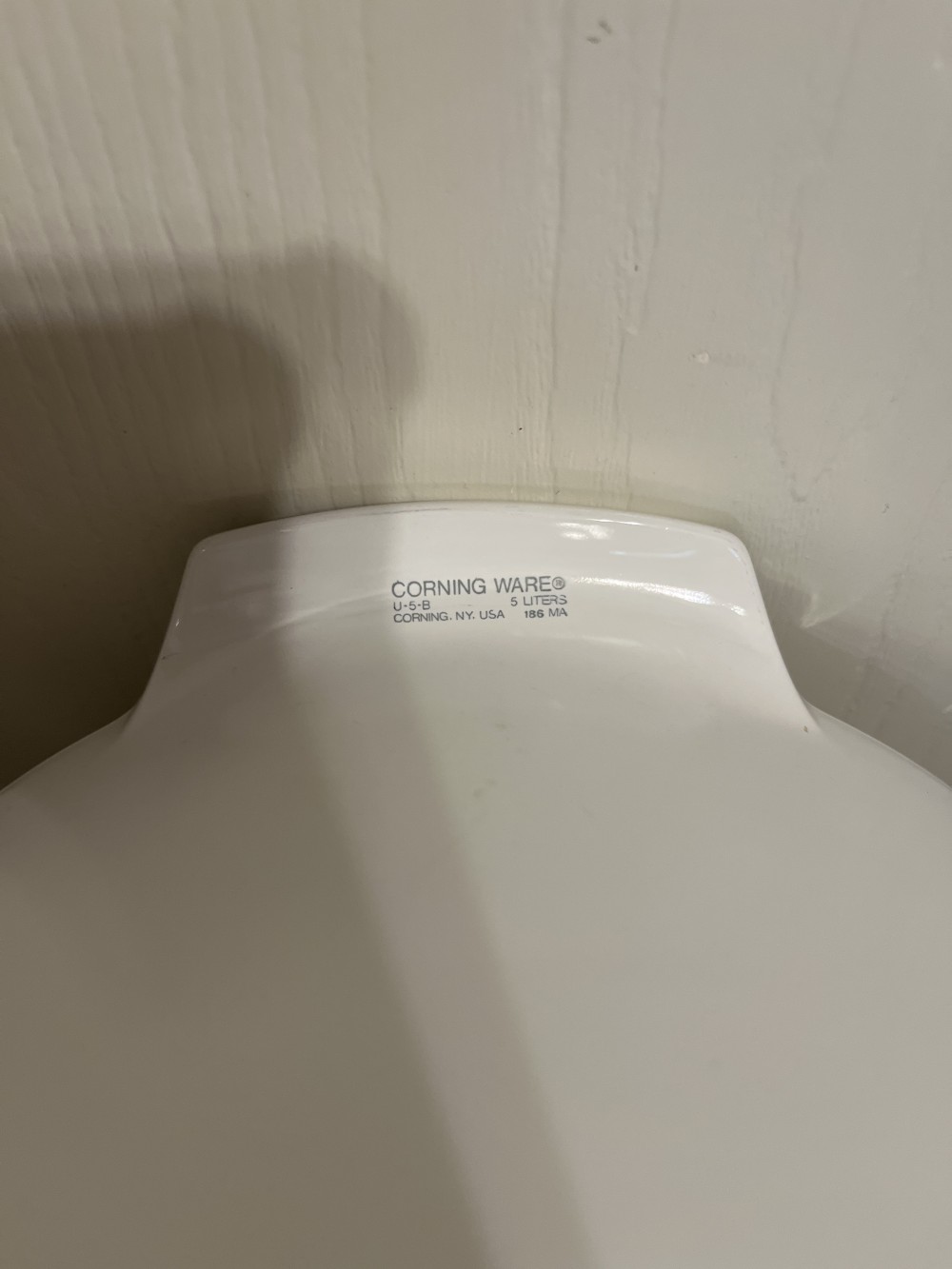 Vintage Corningware 5 L or 5.28 quart solid white buffet server/baking dish. This dish is preowned in very good condition with no chips or cracks, some marks on the bottom from prior use, inside has only a minor utensil mark.