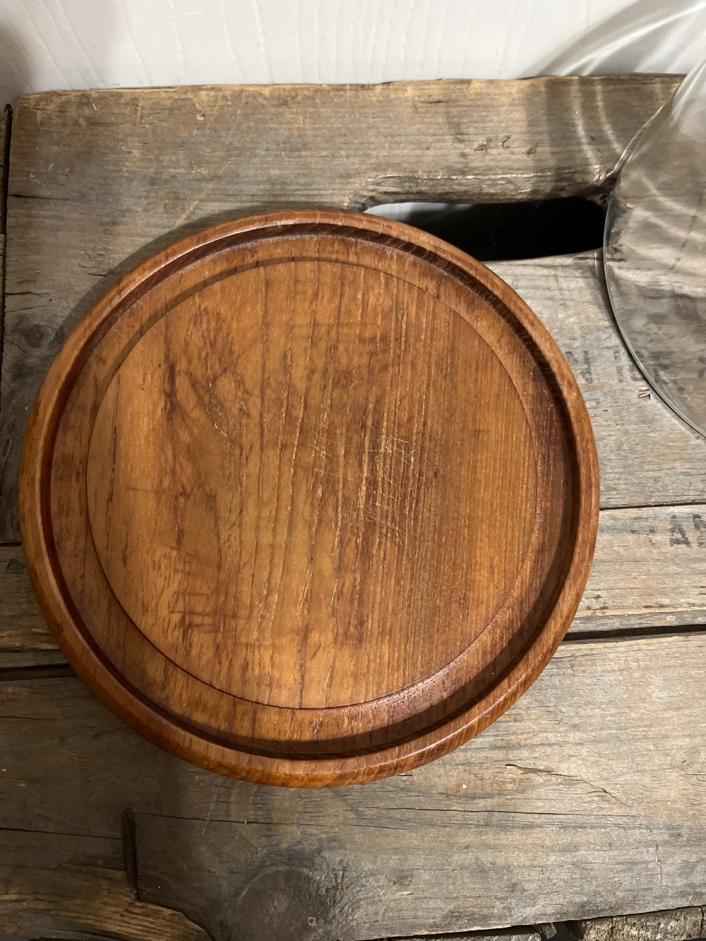 Vintage teak wood cheese board with glass cloche. This item is preowned in very good condition with some knife marks on the surface, but it has been sanded and given a food safe finish. Board is 7 1/4 inches in diameter and cloche is 6 3/8 inches in diameter.