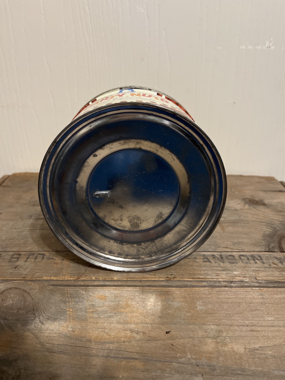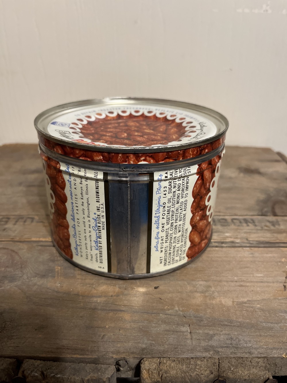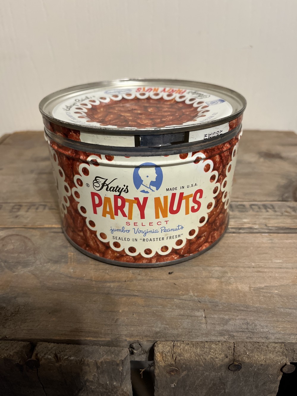 Vintage 1960s Katy‘s Party Nuts can, made in USA by Kathryn Beich Company. This item is preowned in very good condition with no rust or dents. Measures 3.5” tall x 5” in diameter.