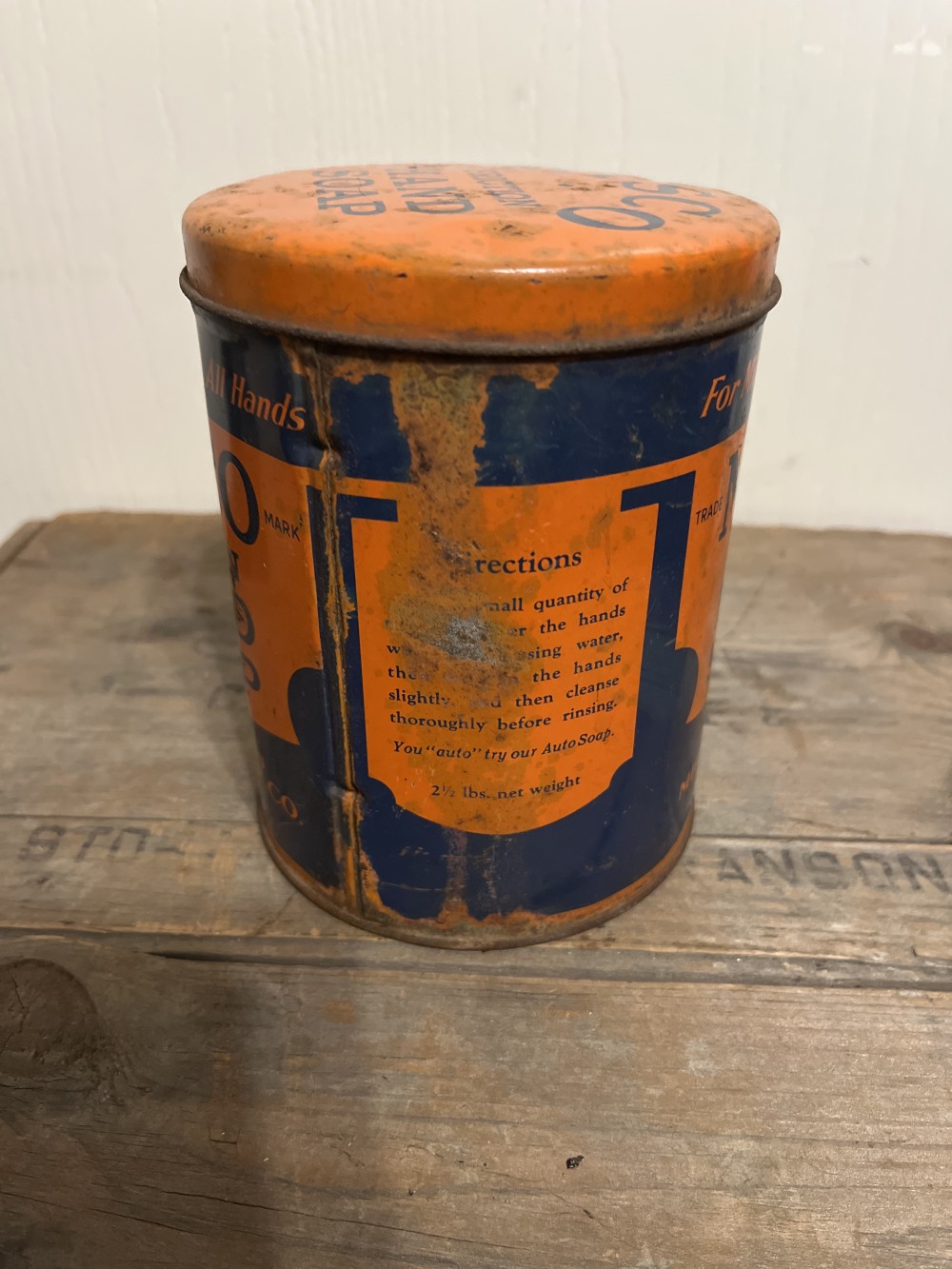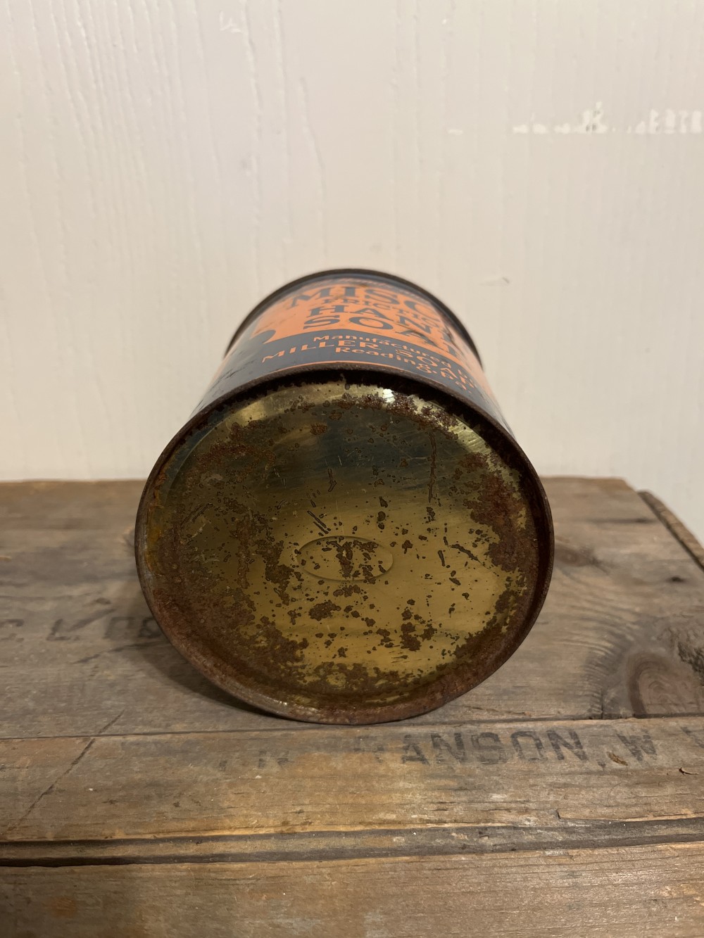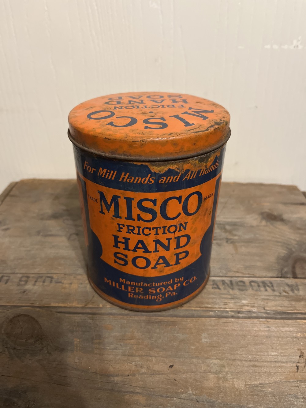 Vintage MISCO Friction Hand Soap tin, manufactured by Miller Soap Company, Reading, Pennsylvania. This item is preowned in fair to good vintage condition with rust spots and signs of age and use, but still makes great decor! Measures 5.5 inches tall by 4 inches in diameter.