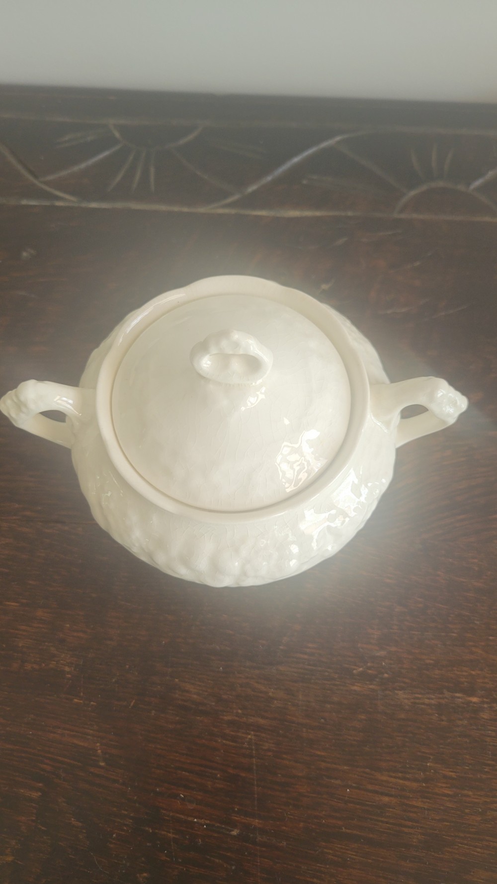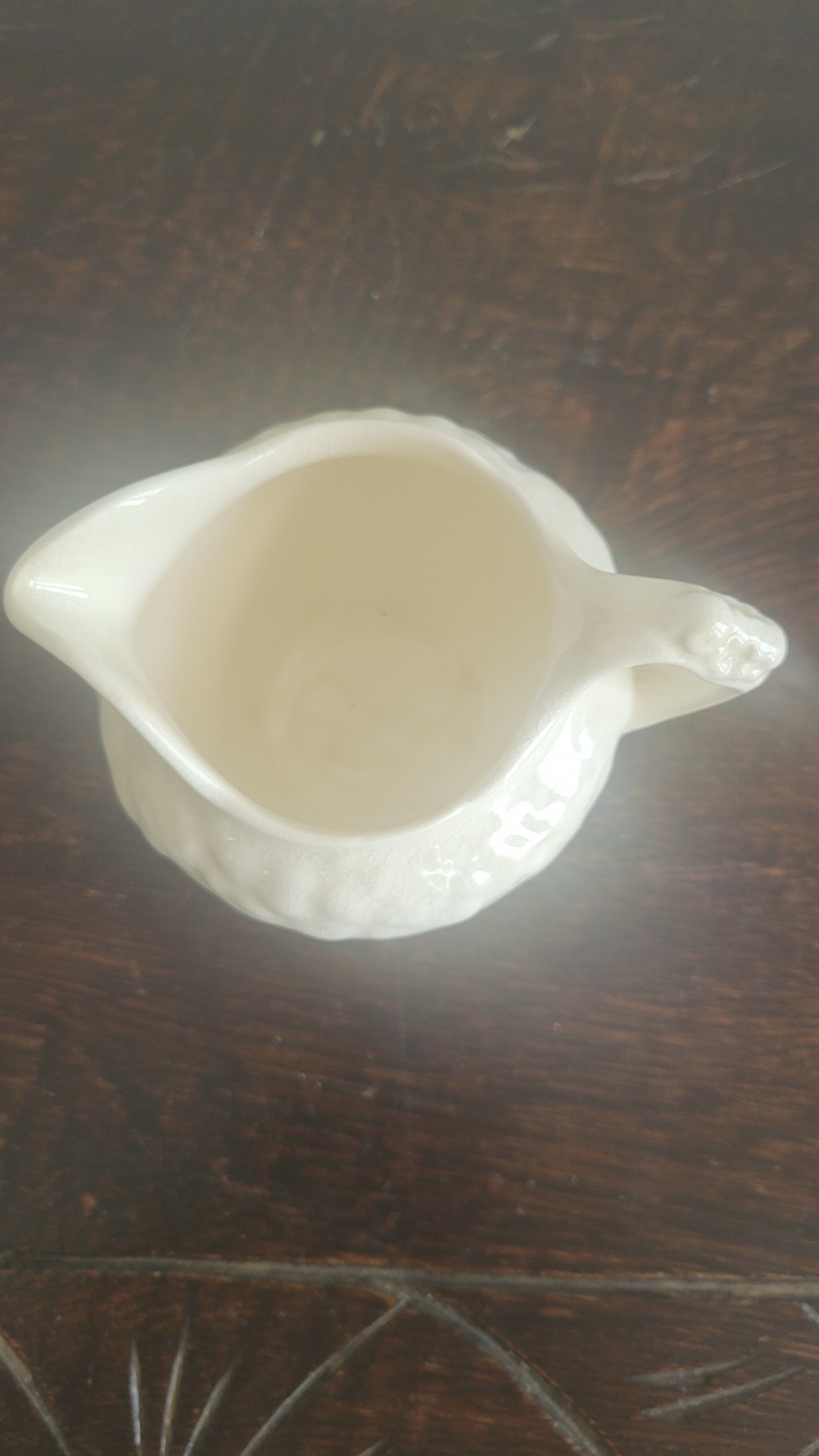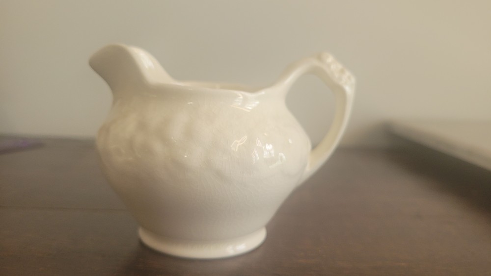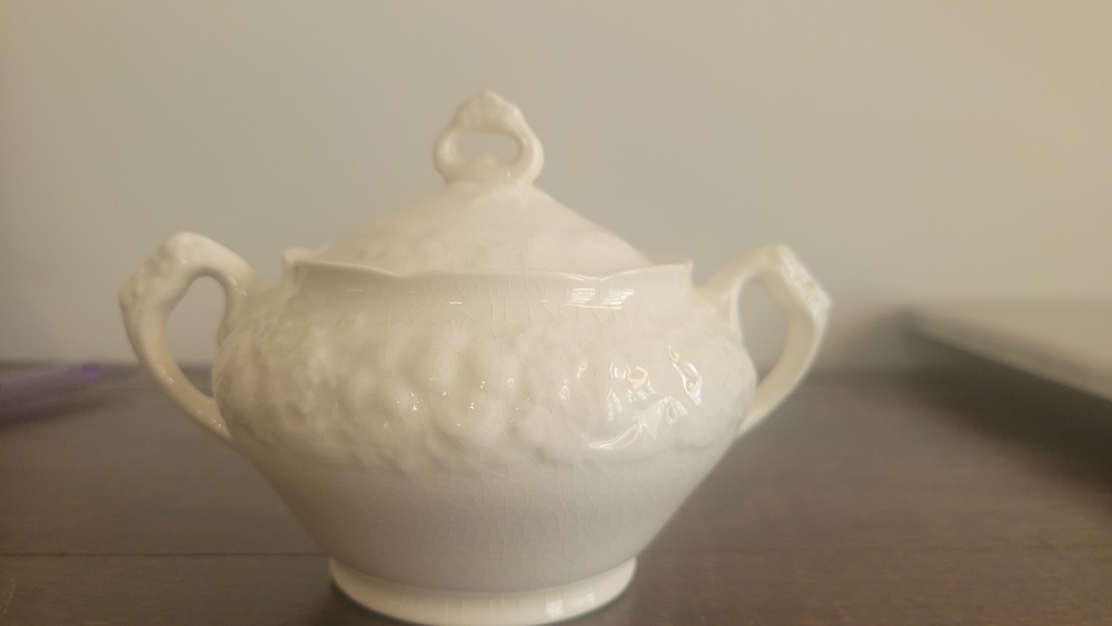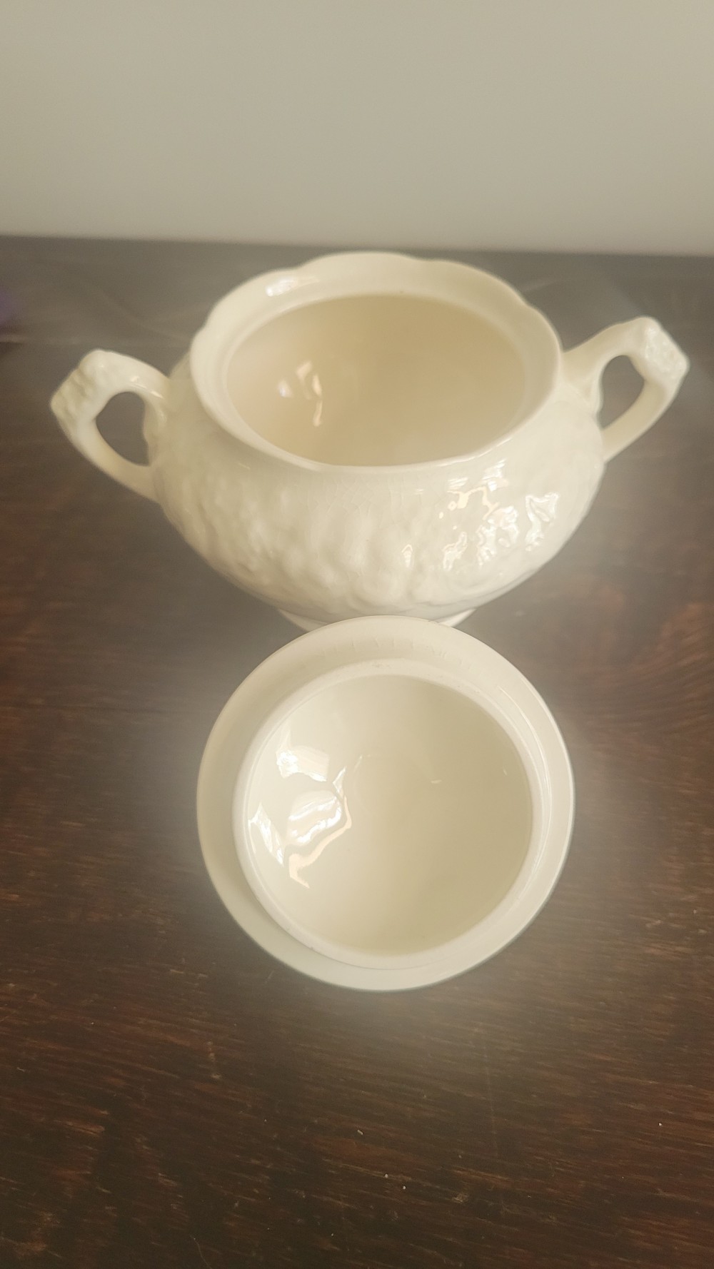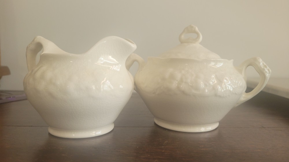 This item is a vintage Crown Ducal Florentine creamer and sugar bowl set with an embossed rim.